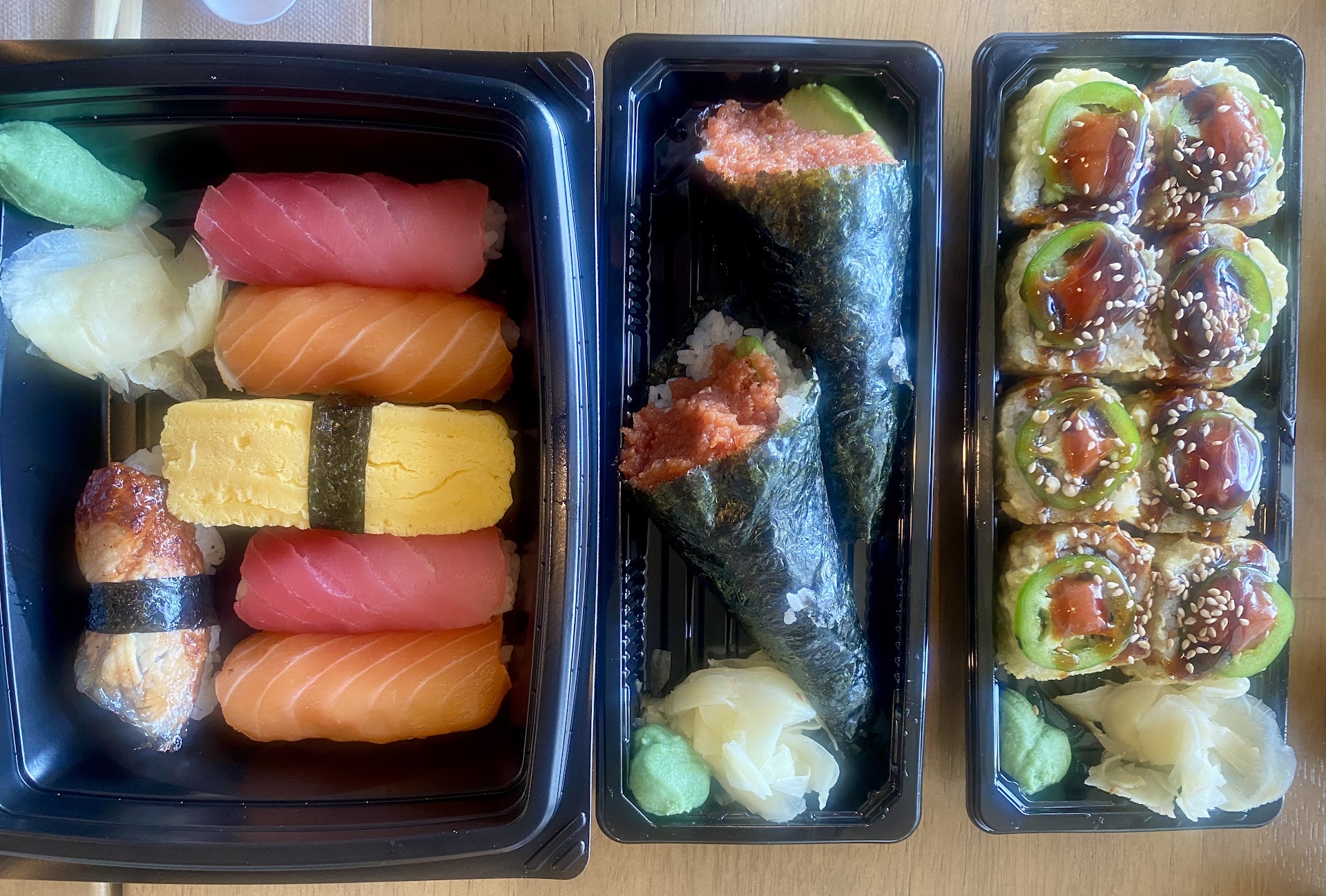 Fuji Grill is a small shop with a few tables and a good menu, many different options for just about anyone. The spicy tuna hand rolls are big. I got one of those and the Super Rainbow roll. It was delicious. The roll came with fresh onion and a sauce that really added something that I don't get at other sushi places. The soda fountain is some brand I have not heard of and I was not used to the taste. They do have a fridge with cans and bottles some and juice. The staff was great, they took and prepared my order quickly ever though there were already several people inside. They also offer take out if you want to grab and go. The beach is just a short mile south on beach so you can eat your sushi with an ocean view if you feel...
