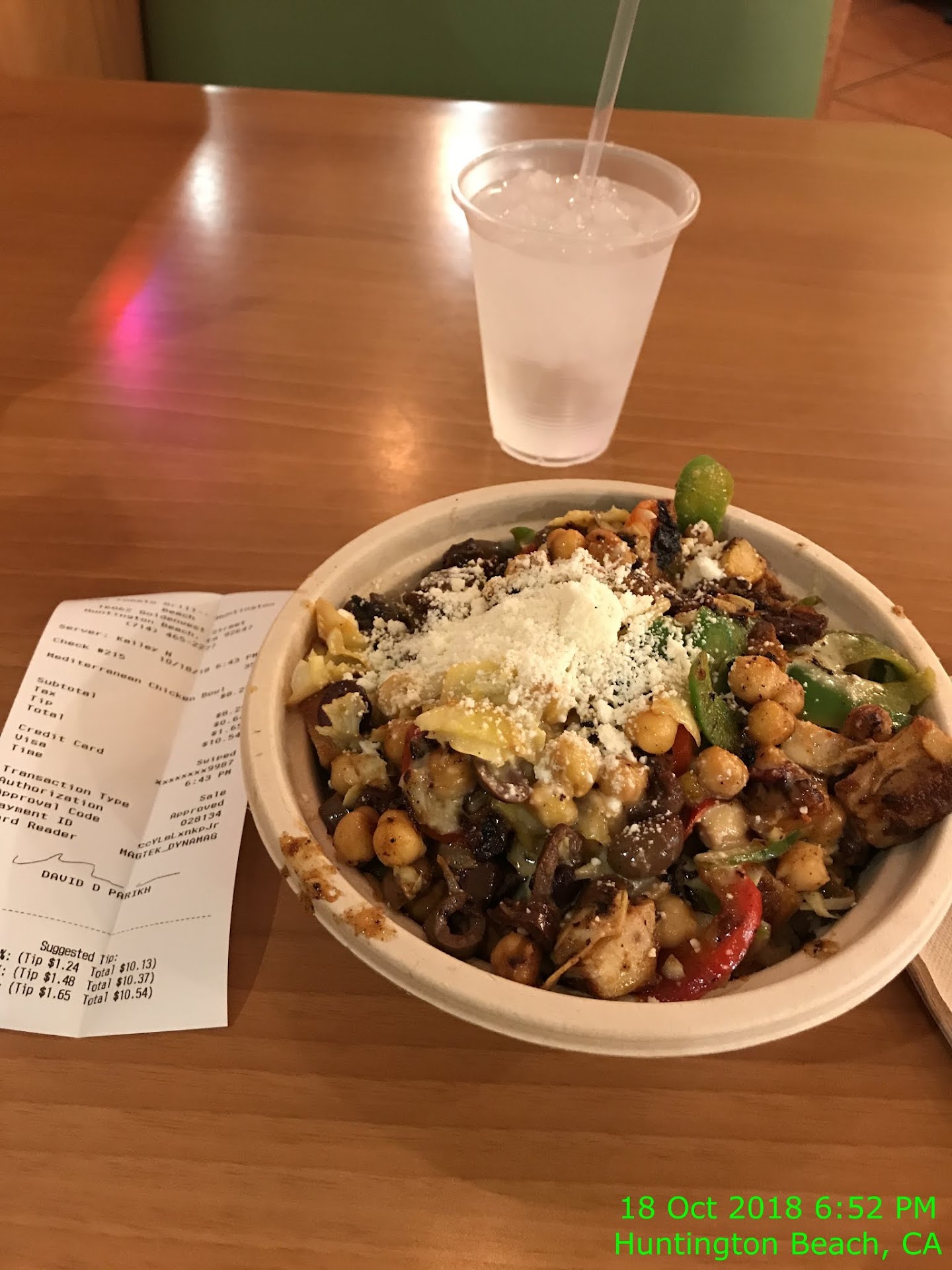 I had the Mediterranean Chicken bowl for 10.54$. You could tell it was made from fresh ingredients and was not precooked then microwaved. Really good, although with the Greek vinegar dressing and Kamala Olives it was a bint intense. (2) I also had the Miso Salad with Salmon combo which came with fries and a soda. that came to 16.65$. The dressing was very intense, I couldn't finish it. Another interesting item on the menu was and environmentally friendly hamburger from New Zealand. The cows are "grass-fed" so that's really good for the environment. A burger fries and drink combo would be 15.60$.
