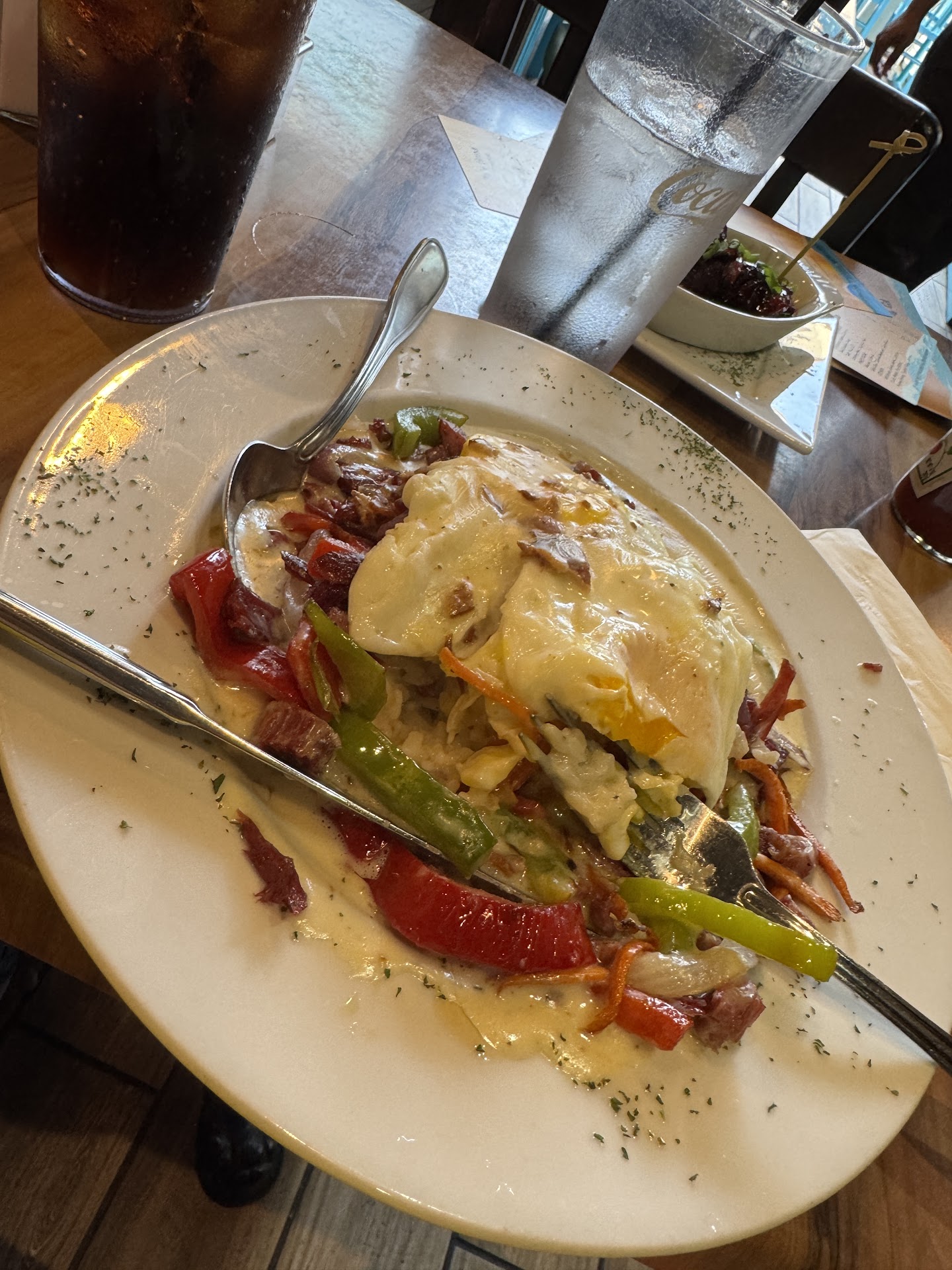 I wish I had more sun coverage while dining here this morning. It was a beautiful day weather wise but the beating sun burning me got to be a bit uncomfortable. The heart of Main Street is shut down to car traffic so that restaurants can set up outdoor dining areas. Service was a bit slow but our waiter very pleasant. People need to support restaurants as much as they can during...