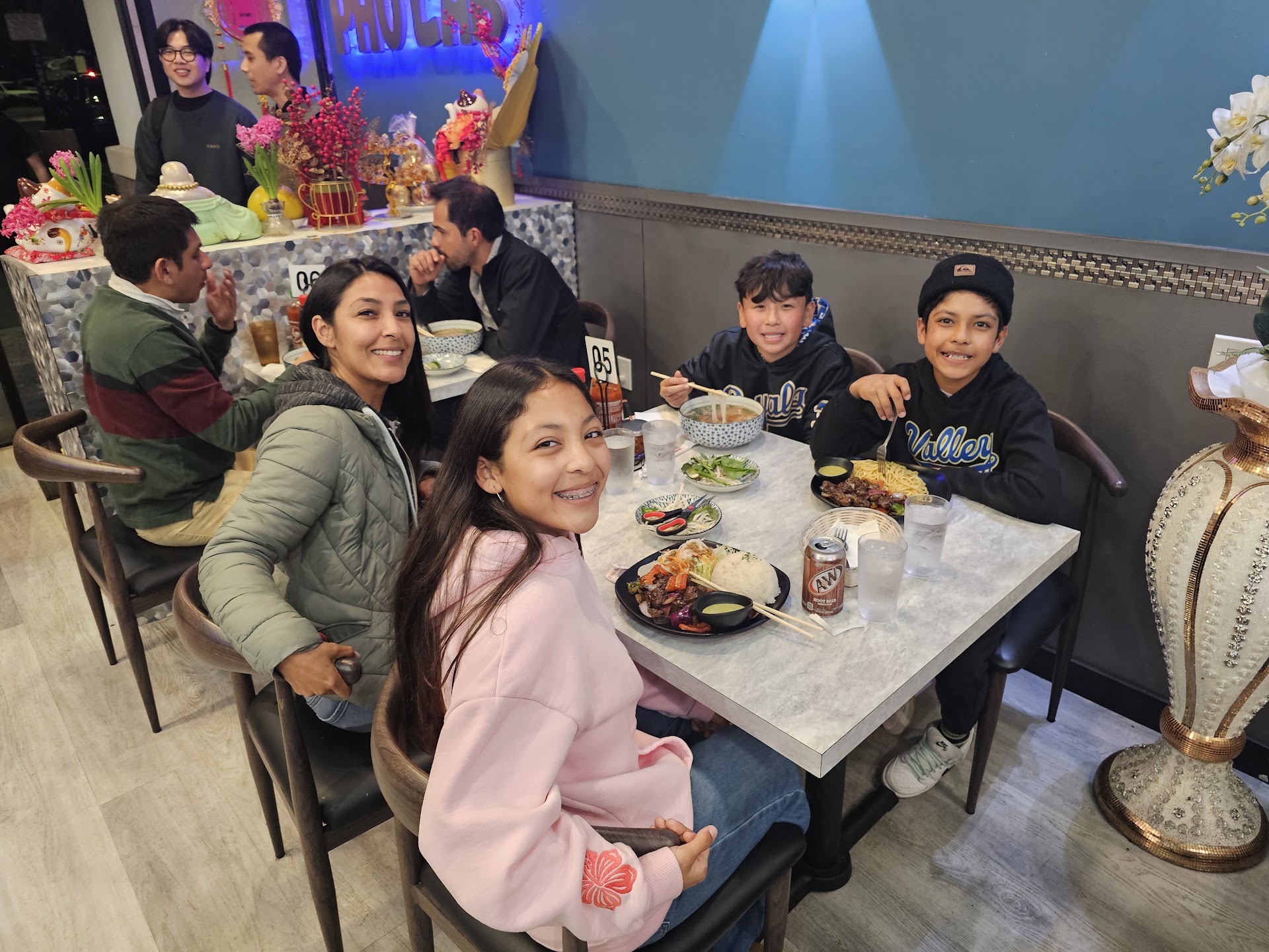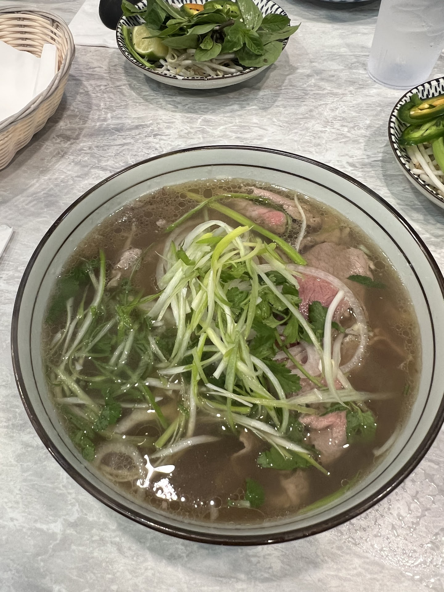 Read moreThis is a tiny spot in a strip mall that we took a chance on, and glad we did! We got there about 15 minutes before the rush, and got the oxtail, brisket, and veggie pho, and tofu spring rolls. The peanut sauce and chili sauce are the absolute highlights, but be careful if youâre not into heat with the red stuff! I love it, numbing first and then the heat creeps up. The portions are huge, and the oxtail was falling apart, 2 big pieces in the bowl. Comes with a big side of vegetables and basil and limes. The service is standard for most pho places⊠they get your order, let you eat, thatâs that. If you want to get a doggie bag though, theyâre super helpful! The only thing I can say could improve is that they tend to bring stuff in a hurry, so I did end up wearing some of my soup. But Iâm clumsy, so Iâd probably spill on people too! Overall, will return! (Side note- the patrons who ended up next to us, which is absolutely not in any way the restaurants fault, were a grey haired dude and a girl of about 16. Donât sit next to them if theyâre regulars. The dude kept âaccidentallyâ brushing his hand on my 15 year old daughters arm while gesturing and then grabbed her butt as she was getting up to get away from him, after Iâd sung some song lyrics about violence toward men quite loudly and told her to leave out her dads side of the booth. If you see this, next time I...