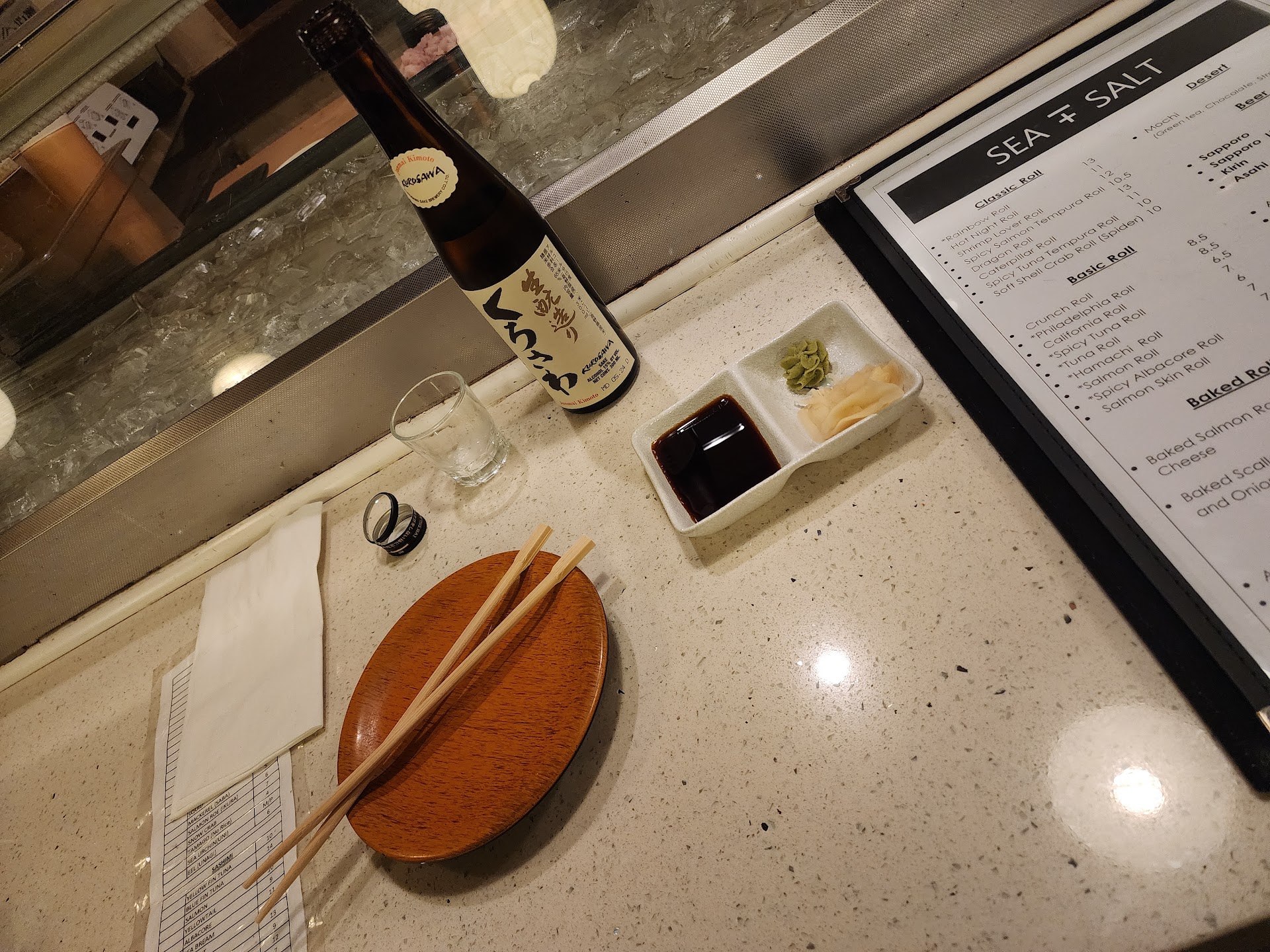 I ordered the hamachi cut roll, a salmon skin hand roll, fresh Wasabi, and a bottle of kurosawa cold sake.