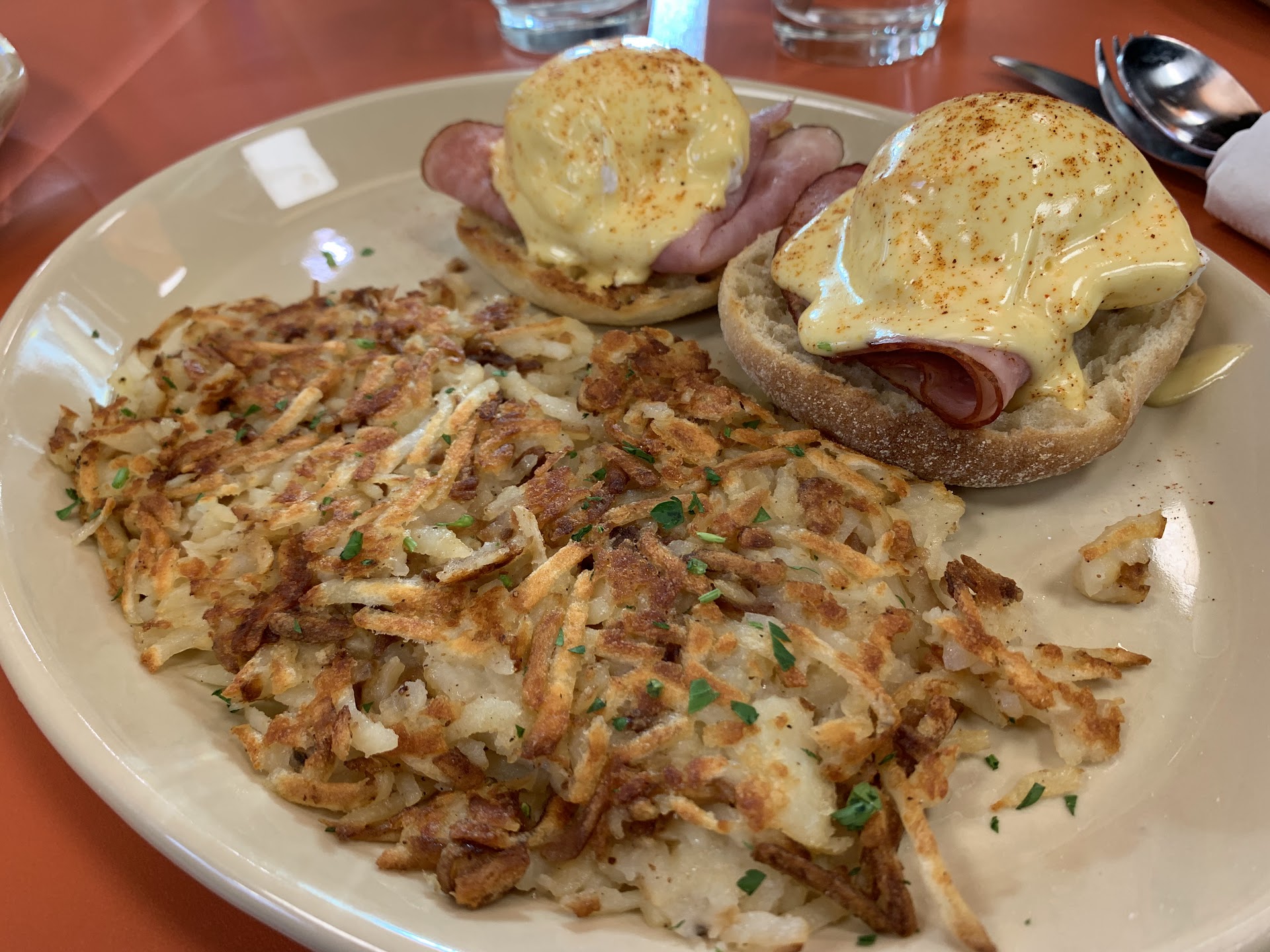 My husband ordered the spuds deluxe with sausage and cheese. I opted for their classic eggs Benedict. I remembered getting a Benedict trio from the SD location so I knew it was good from previous experience.