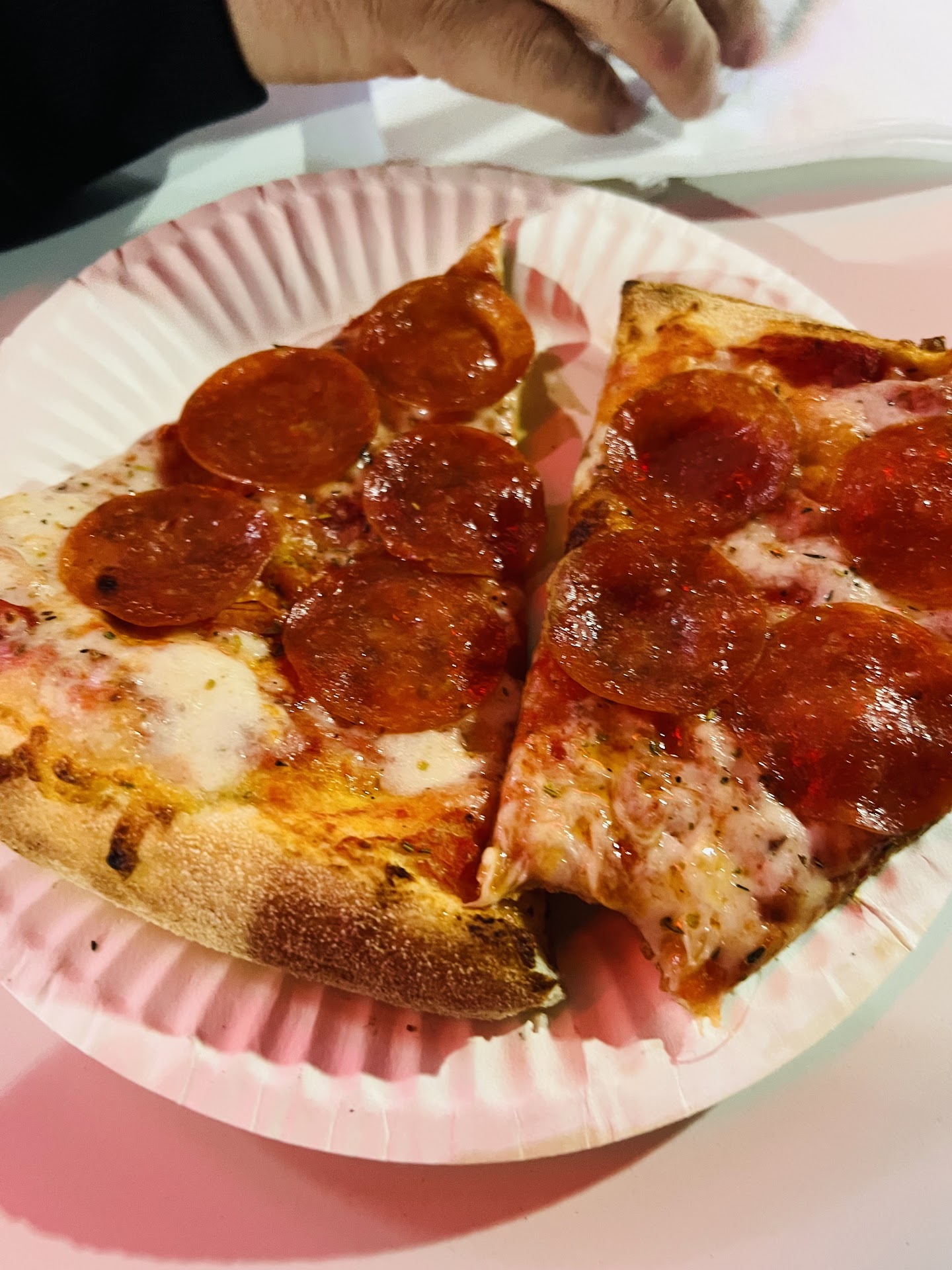 The sign on the register said slices $3 each or 2 for $5. We opted for 2 slices. Only choices are cheese or pepperoni. We went with pepperoni. She asked if we were going to eat there or take it next door to the brewery? Hmmmmm…. Next time that might be a good option!