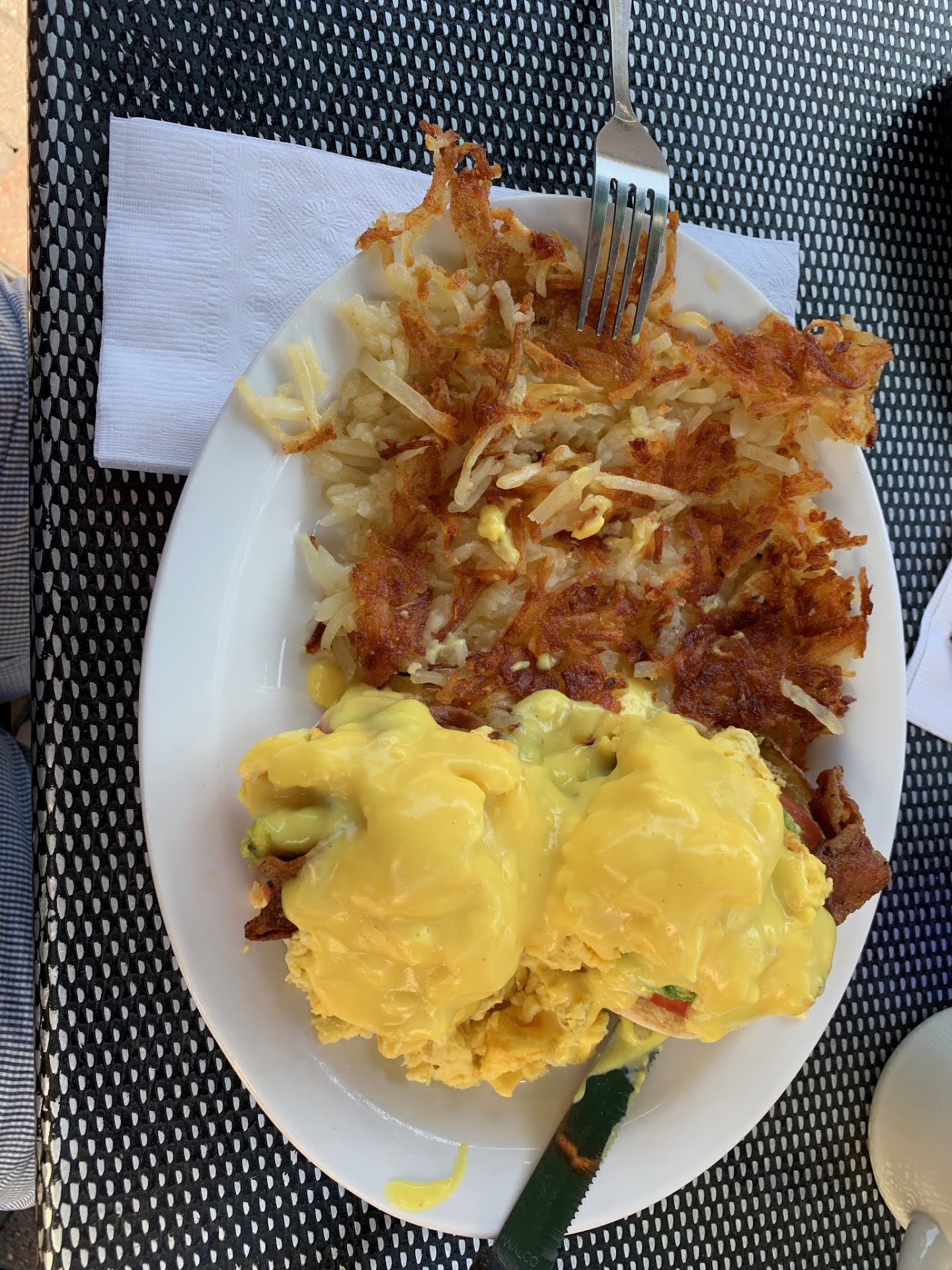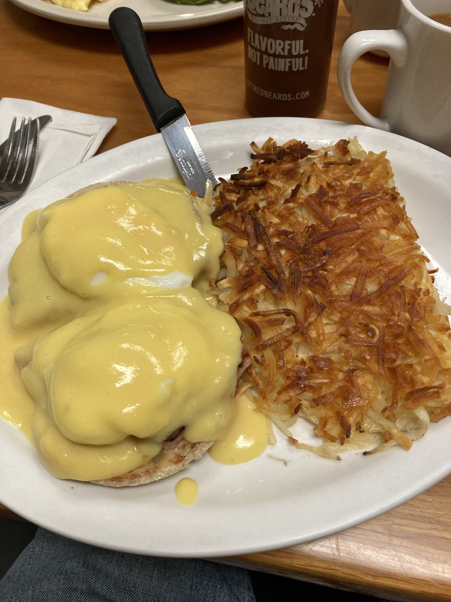 The food was EXCELLENT. I know, you might be thinking how excited can you get about breakfast, but it was great. Coffee was delicious, bacon was crispy, eggs were fluffy, hash browns were particularly good - crispy, not the least bit greasy, just great! And the eggs Benedict (day two, this morning) were out of this world! First of all, I’ve almost never had an eggs Benedict dish come out hot, in any restaurant, ever, but here it came out hot! And the Hollandaise was great, not too lemony, smooth as silk; the ham was tasty, too! Nice English muffin too. Just the perfect eggs Benedict.