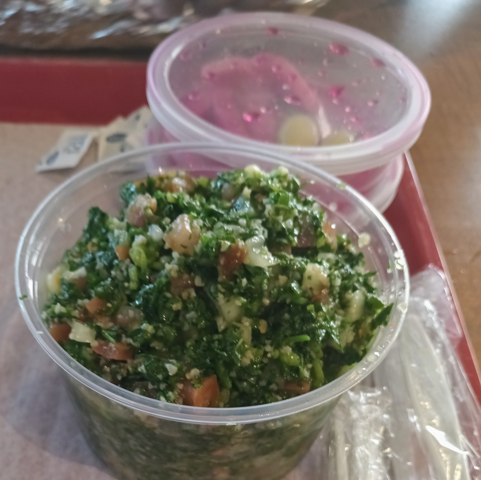 Their recipes are top notch Basmati rice top notch Tabouli ton notch. Tabouli is a fine parsley salad that for some reason or another is hit or miss in any Mediterranean cuisine. Having the perfect ratio of parsley, tomato, onion, and cucumber, and the right amount (substantial and also essential: seasoning (lemon, salt, oil), are keys to the success, along with the very fine chop.