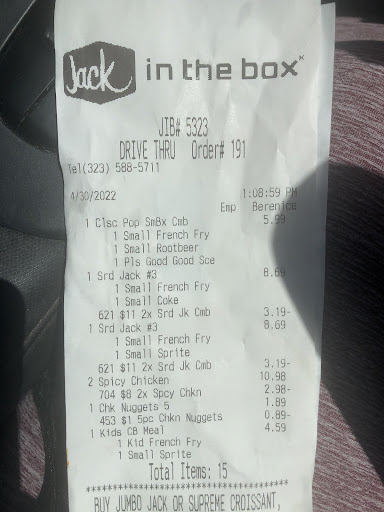 Read moreCustomer Service Matters! At no time should I feel as though I placed my order wrong when I am the person ordering the food. The food was fresh when we received it, but the drinks were wrong and we went over them twice. But when they were handed through the window one drink was wrong. I ordered 1 RootBeer 2 Sprites and 1 Coke. I was given 2Cokes 1 Sprite and 1 RootBeer. When I told her it was inaccurate she replied I asked you if it was correct before we made them. She could have been a bit more pleasant but instead she asked for the drink back and asked me what I wanted rudely! I looked at the receipt and yes I did order accurate. Her customer service has lost this Jack In The Box my patronage. The proper way to handle my concern was to say ma’am our apologies let me get you the correct drink, not I repeated the order and you said yes when the receipt clearly showed that and you still got it wrong. Be more pleasant...