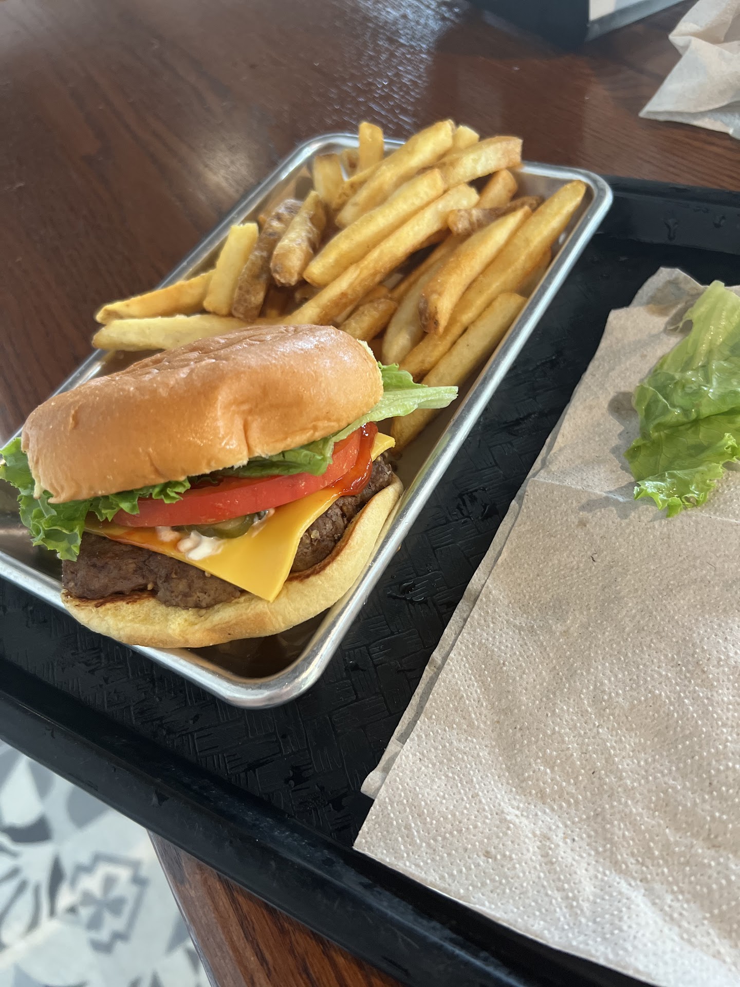 By god I have never had a worse hamburger. I ordered a cheese burger on a brioche bun with pickles. Somewhat overpriced, I thought, but it should be fine. It was not fine. It was the most unpleasant tasting experience I’ve ever had. The entire thing tasted like plastic and chemicals, and the meat had a shine to it. The bun was dense, tasting like it was frozen for months before hand. The cheese, an amalgamation of factory-made chemicals. The “burger” tasted bland, but not “bland” as in it had no flavor, but “bland” as in it was oppressively stale, chewy, and preserved. This burger - this THING - is humanity’s hubris manifested, our content for the natural order has blinded us to the endless consumption we partake in. We alone shall be our downfall, and when we fall, we will have no one else to blame then ourselves. The lemonade was pretty good...