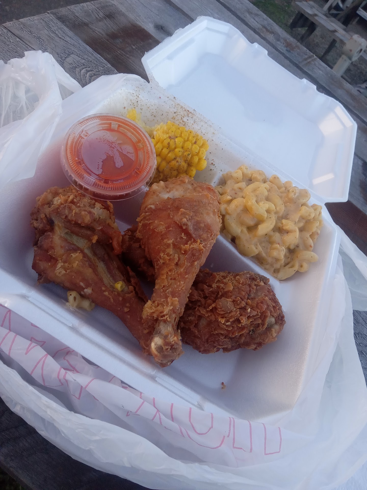 Read morePhenominal! Ordered the 3 chicken legs combo. Corn and Mac & cheese. Caned vanilla coke (rarity in itself) to drink. Maybe it was the bad experience at jewel city but wow what fast service here. Literally just long enough for the chicken to cook. Almost immediately served. Food was out of this world good. Actual southern fried chicken, skin and all. Crispy on the outsude juicy and succulent on the inside. I'm from NC and fried chicken and vinegar based pulled pork are 2 foods I take very very seriously. This place nails it. Best I've had here. Made me muss home. Better than Camden corner and that is saying something because Camden corner is top notch. But as good as the chicken was the Mac was better. Not simple but exploding with flavor. Thick and cheesy with flakes of pepper. You can tell love and care went into that. The corn on the cob was good too. Not a simple over cooked sweet corn on a stick like at KFC but good cooked until done, not over done, and with a dollop of mayo and seasoning. The hot sauce Truly was good but im not a fan of spicy to even with disliking the heat i can appreciate the flavor. Truly a hidden gem in huntington. Even for a "to go" place it does offer seats and didn't turn me away even though I was on foot at the time. The very attractive woman that took my order was very polite and very fast. Took my order, confirmed it (another rarity), and handed it to me in seconds. Highly recommended for...