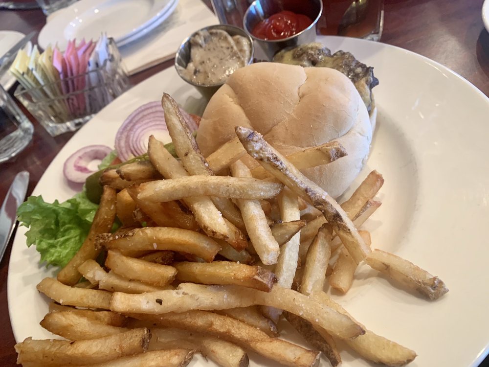 I have heard great things about their burger for YEARS, so I decided I'd try that. Two of my coworkers split the burger and fries and each got side Caesar salads, and my final coworker ordered the chicken pot pie. I asked for a sweet tea to drink, which was a mistake; I was offered my choice of simple syrup or sweetener to mix in myself. I personally really only think sweet tea is good when the sweetener is added while the tea is brewing, so that was kind of a disappointment.