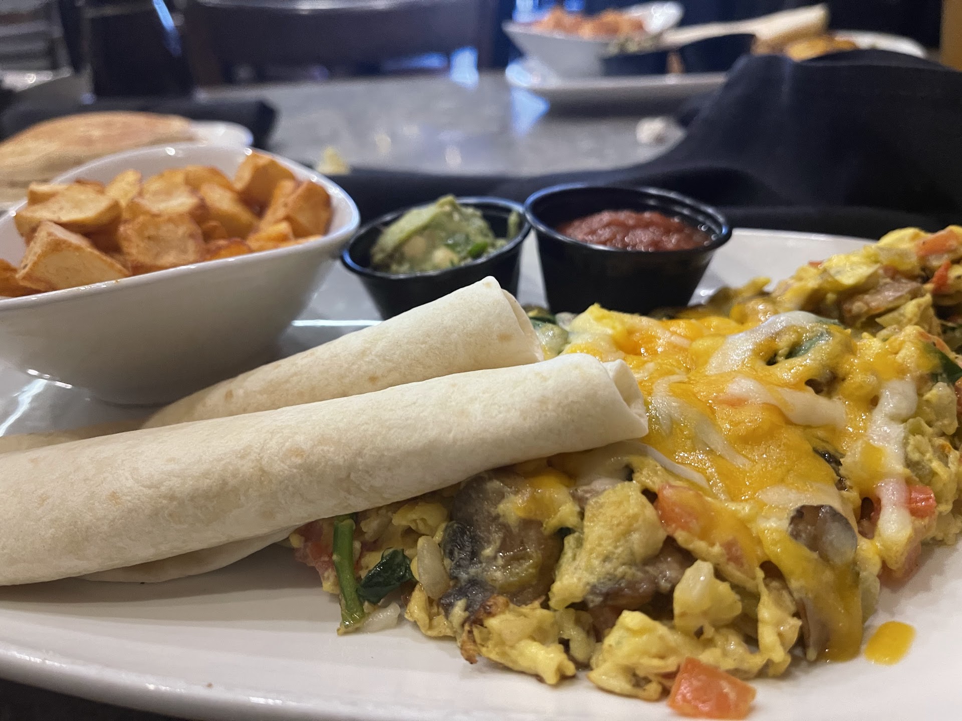 I ordered the Southwest Scramble, removed the meat, and added spinach and mushrooms. It was absolutely delicious! To enhance the flavor, I requested sour cream and hot sauce, which were the perfect finishing touches. The breakfast potatoes were a standout—perfectly crisp and wonderfully seasoned.