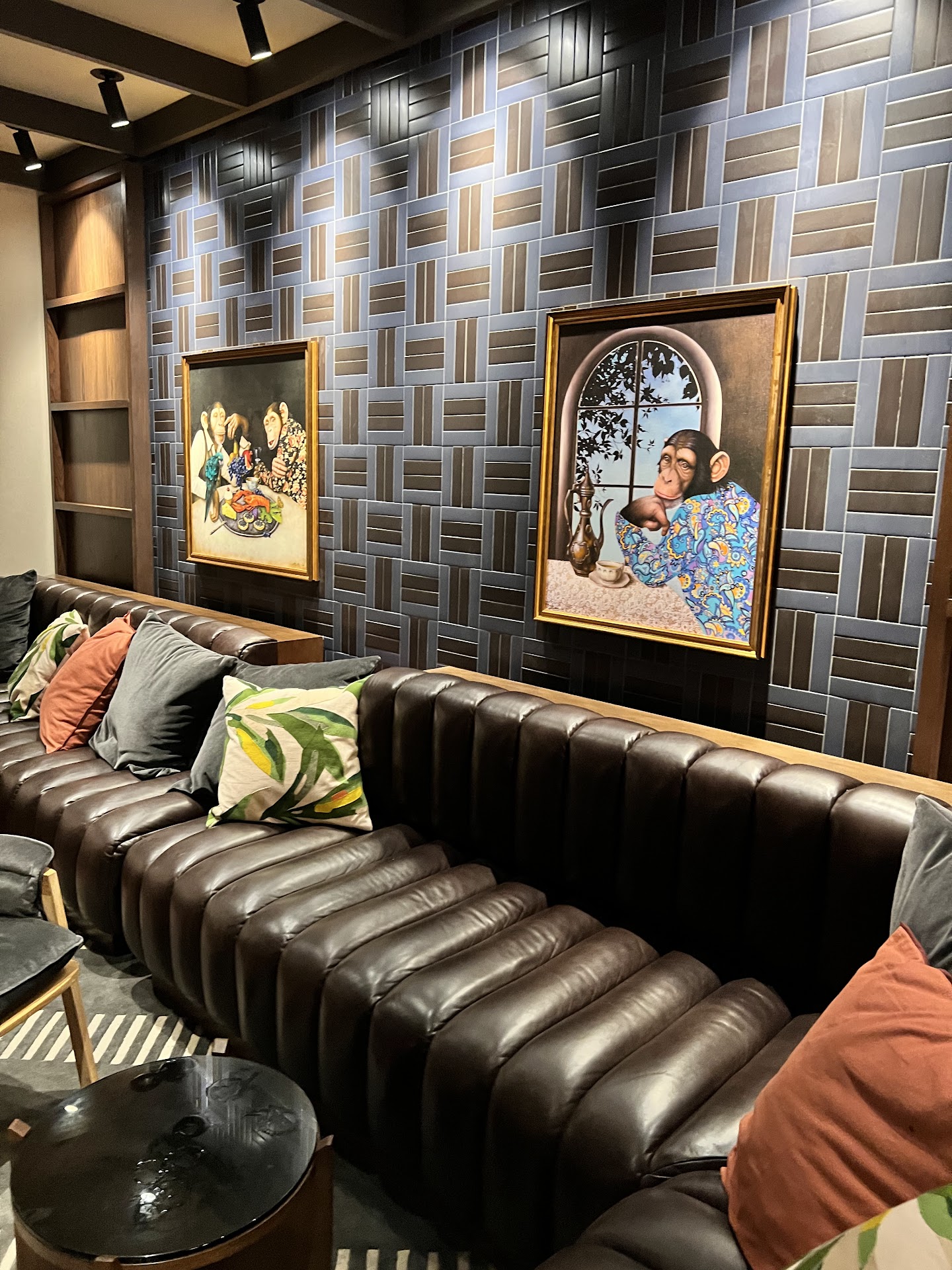 I will grant them that the vibe is pretty pleasant and the whole first monkeys in space thing (hence Baker and Able) is an adorable theme. There are several cute touches/allusions to this space history, including flashy monkeys-in-the-jungle wallpaper and two statues on the side of the hotel better viewed in daylight.