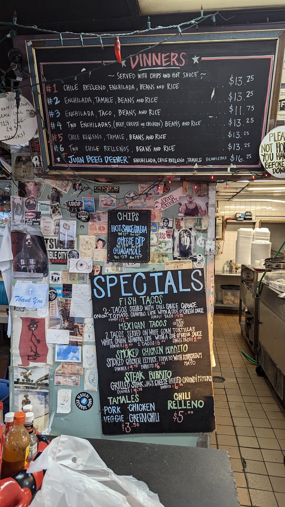 For my part...I don't know that I really get it. It's fine. The aforementioned parking lot is super difficult to navigate and isn't in the best condition, so be careful. The restaurant itself is definitely a dive, which may or may not charm you -- I for one like dives, so I enjoyed the funky atmosphere. Seating is pretty limited and it fills up fast. You order at the counter and food is brought out to you. The menu has lots of burrito options, as well as other items like tacos, tamales, enchiladas, etc. Burritos can come a la carte or with rice or beans. Chips and salsa or cheese dip are separate and additional cost.