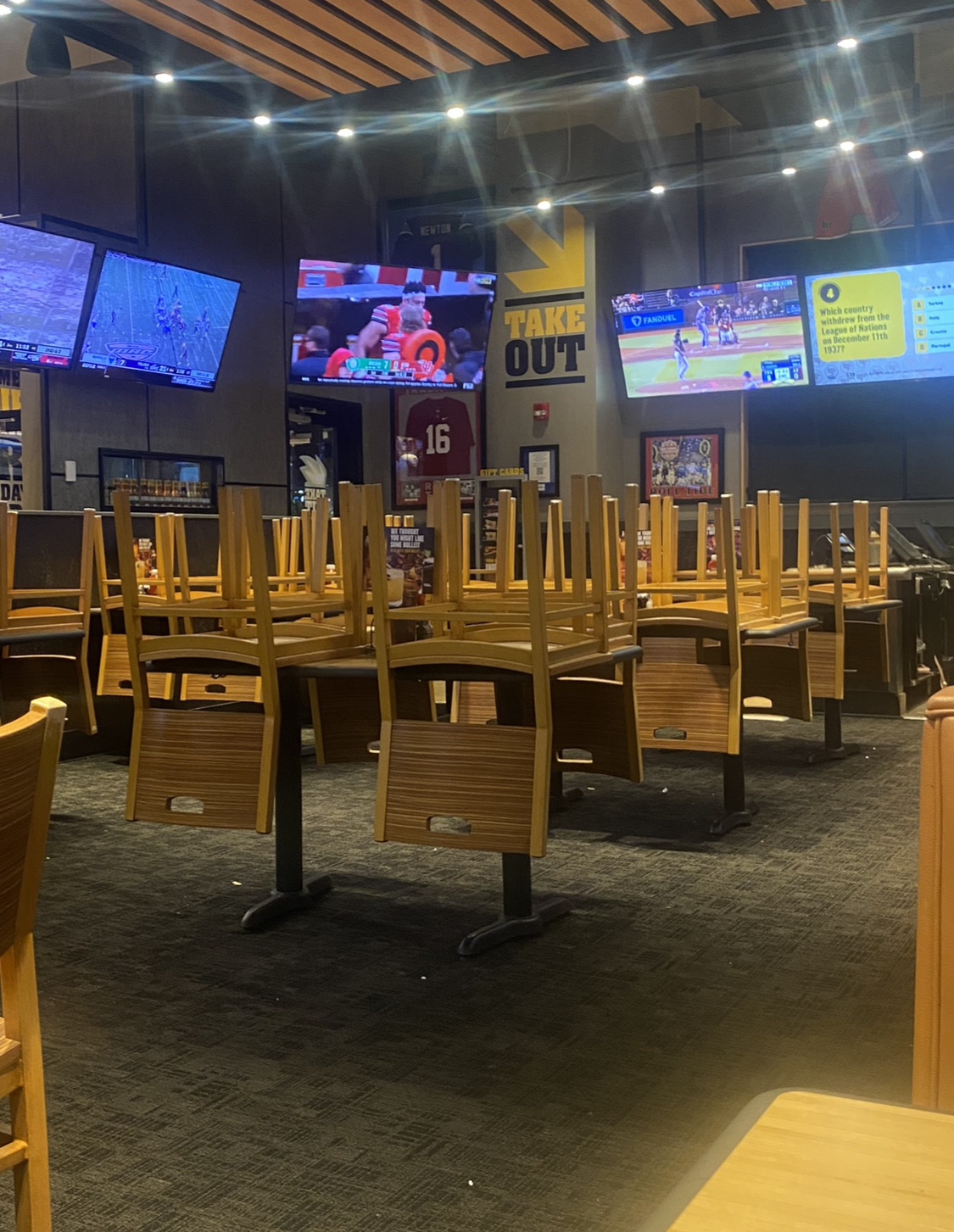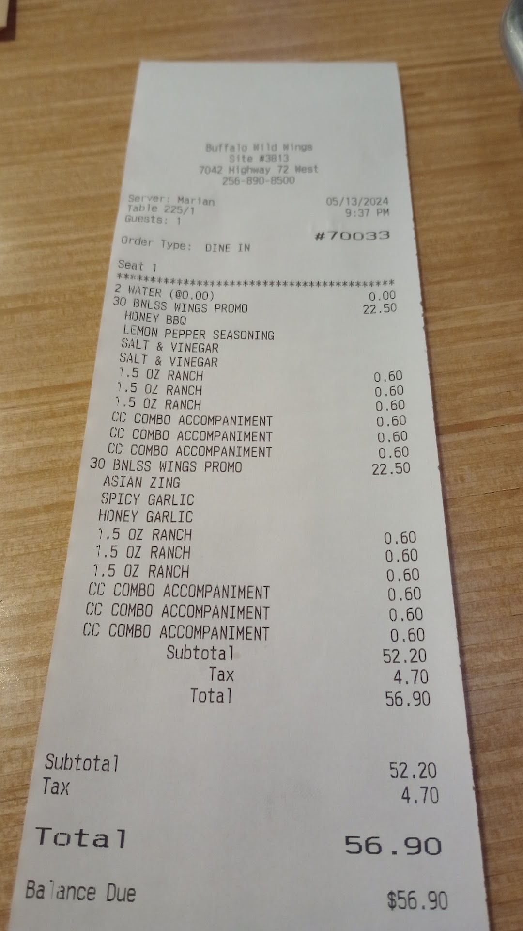 We ordered takeout at 6:57pm on a Tuesday night. This was not the closest Buffalo Wild Wings to our house, but was on our way home from an errand. We live about 20-25 min away. First, I could barely understand what the guy taking our order was saying and kept having to repeat myself. After 40 minutes of waiting, they finally called my name and handed me what I thought was my order. I was so upset due to having to wait so long that I didn’t even check my bag to make sure they got my order right before I left. I mean after 40 minutes, you’d think they would have taken the time to do that. We make the 25 min drive home and open the bag to realize it’s not our order at all. Not even close. So I get back in my car and call the restaurant on my way back to tell them they gave me the wrong order. I was placed on hold for a few minutes while the guy that answered the phone got the manager. She proceeded to tell me that I took the wrong bag and it was a large order, which they had to remake and she didn’t know how they could mix up a 40 piece wings order with a snack. I told her that I didn’t just order a snack, but had a total of 28 wings and fries. I felt as if she was blaming me- because I wanted to get home, find out I got the wrong food, and drive all the way back to the restaurant to get my correct order. She never apologized and said that my food was already ready from before and I could come exchange the wrong order for mine. I said that that food was made 40 min ago and by the time I get there it will be an hour old and that I didn’t want hour old food. She said she’d tell the kitchen to remake it. Again, no apology at all. So I drive back to the restaurant and tell the guy I called and spoke to the manager and she said they would remake my food, gave my name and receipt, and handed back the food. That guy said he’d check on it and then disappeared to the host stand for 30 min. After waiting about 5 min, the manager came up and asked the 5 ppl waiting for takeout their names so she could check on their orders. I gave her my name. She offered everyone else that had been waiting for a while on takeout a free appetizer and an apology, but not me. I watched every person get their food except one before mine arrived 50 minutes after I called and talked to the manager and 30 minutes after I arrived back at the restaurant - @ 9pm. This was over 2 hours after my initial order! I’ve never experienced such poor customer service. Don’t go to this Buffalo...