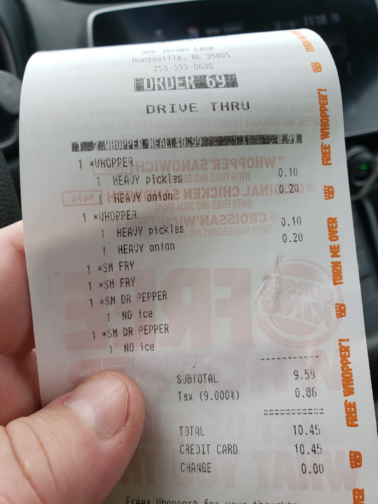 Read moreThe first thing I hear is the lazy ",,, manager yelling at her cooks , cashier and even the drive-thru cashier for the most stupid stuff you ever think about. " like Team Work , helping you co worker out when your not busy. "Right" I think she take revenge of the ones that really need a job to survive day by day and there's nothing wrong with that we all been there at one point in our life. I think this reflects on the quality of the food you get from there along with all these cutbacks they have made. Like there Whopper jr. Is so small now it's ridiculous in their Whopper is all bread lettuce and tons of mayonnaise you can't even taste the meat it is so thin. By all means don't take your children into a Burger King off of Jordan Lane or Whitesburg Drive , because the management at those 2 store's will cause you to leave by hearing the way they talk to their employees. So I hope you're getting what am saying. . You know that show Undercover Boss well Burger King nice their CEO to go undercover and make the changes before they go out of business. All we can do is pray one day they found a better job and get treated with respect and dignity...