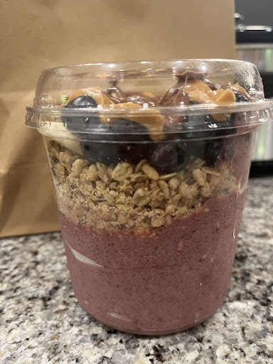 My two favorite bowls so far are the powerhouse bowl and the island bowl. The powerhouse comes with acai, granola, blueberries, strawberries, bananas, and peanut butter and Nutella drizzle, while the island bowl is made with pitaya, granola, kiwi, strawberries, and pineapple, with coconut flakes, honey, and bee pollen on top. They are both delicious, plenty filling, feel healthy, and with a balanced amount of sweetness, despite no added sugars! The ratio of toppings to base is close to perfect and the base has never been icy or gritty.