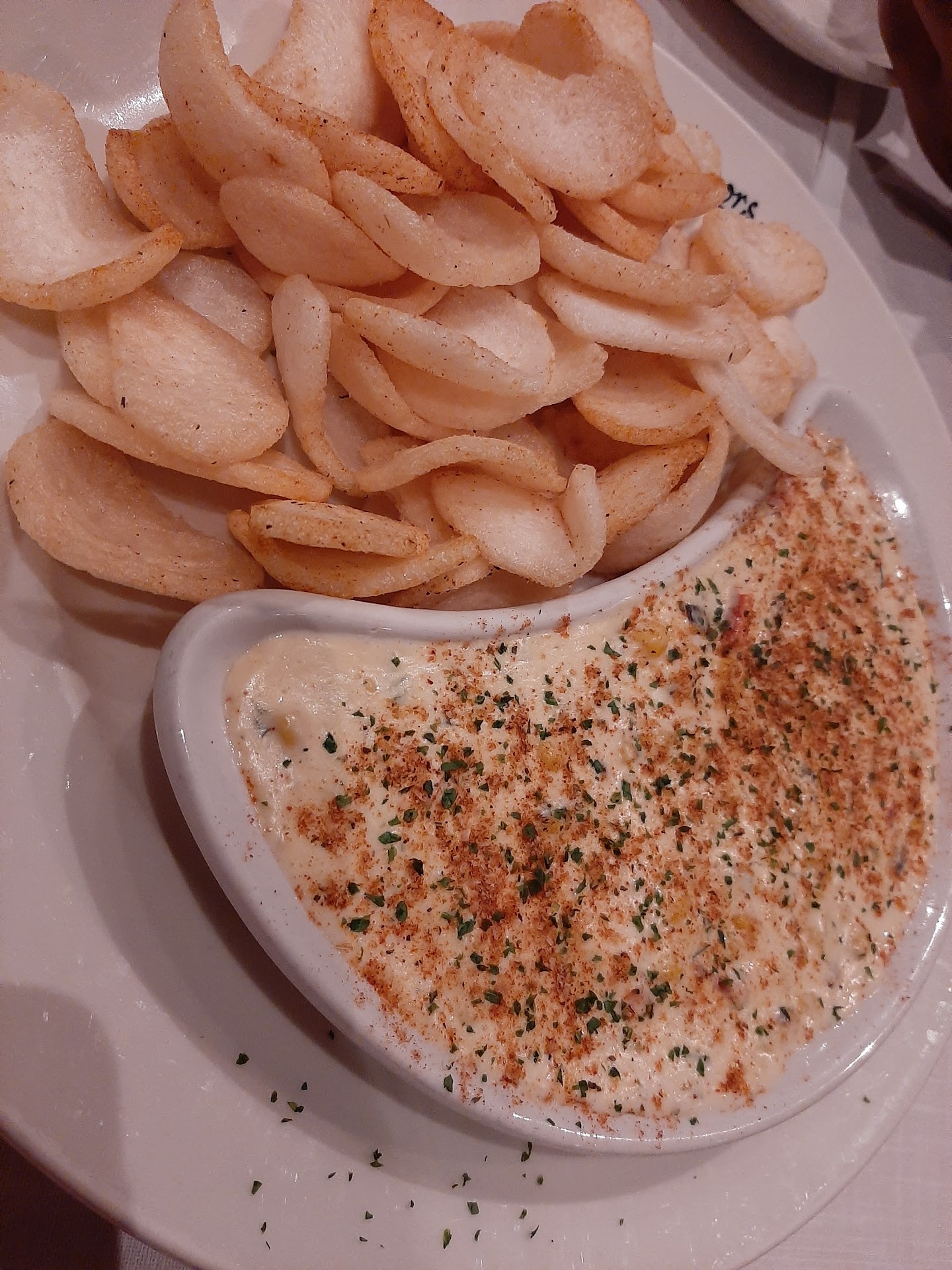 I was definitely surprised that I was able to have the lobster dip, although I did find it slightly lacking in Lobster it was definitely delicious and there were definitely pieces that I could see in the dip. I really appreciated that it was served with prawn crackers so that I could eat that as well. When my shrimp came out they were absolutely overcooked and dried out, they brought me back some new ones which were definitely cooked better some were still dry but far better than the first dish. The potatoes are nice and large and you're serving size of sides is quite nice as you can see that is quite a bit of asparagus on the plate compared to most other places. The Caesar salad definitely had a lot to be in this type of restaurant, it was just basic lettuce and parmesan cheese with a caesar dressing on the side although the...