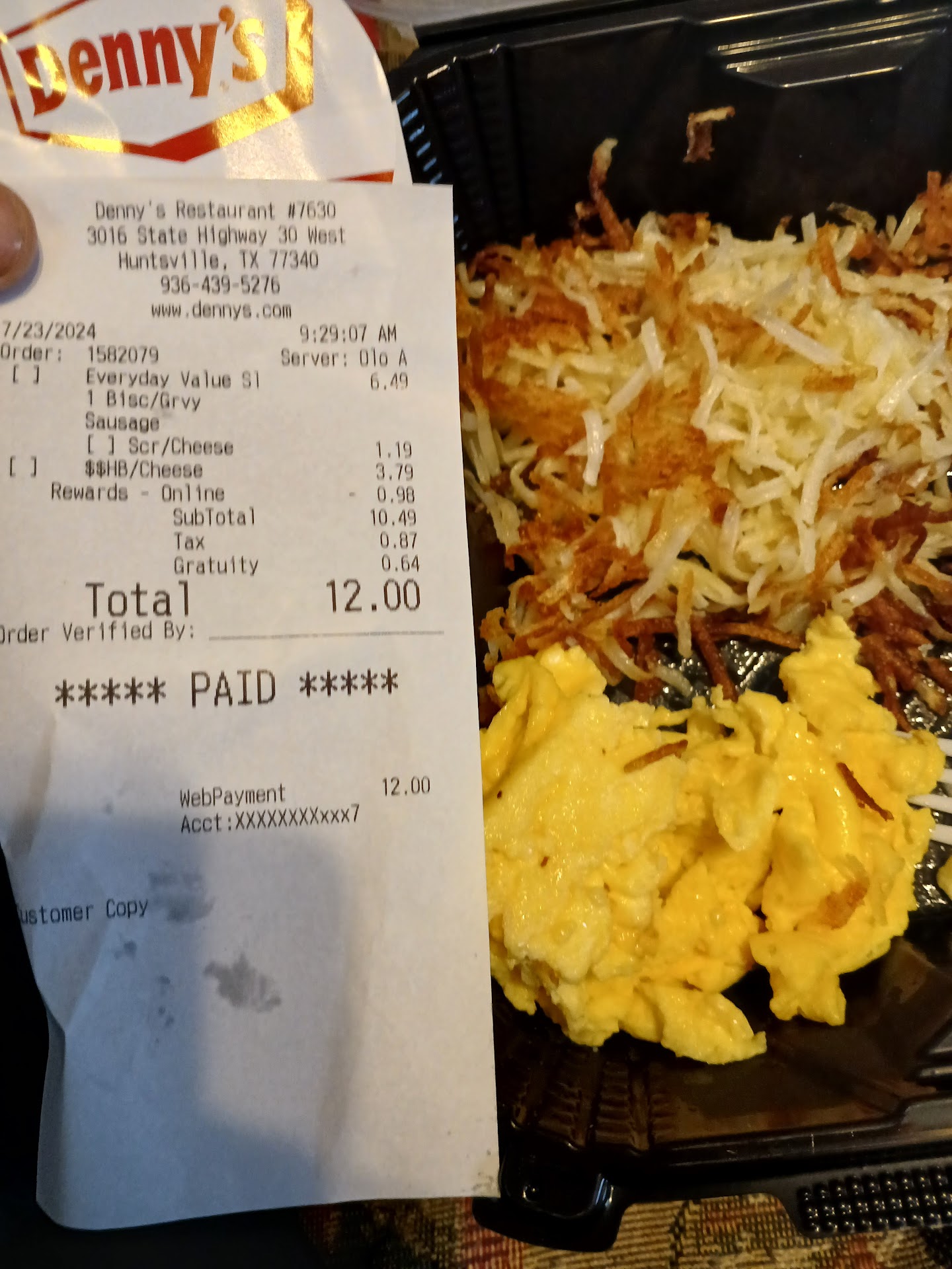 The worst Denny's I've ever been to. I love this restaurant, and there's only one in our town, and I can honestly say I'd rather go to Conroe. I came into this place at 8:30pm 06/13/2015 and was given the waiter Neal (reddish blonde hair, scruffy unshaven face, disheveled). He took a minute to get to us, which is fine, we wanted Denny's and they had a couple customers (4 tables seated at the time throughout). Our table was soiled, had bits of salad left on one of the place mats (we requested a two-person booth) and missing silverware. When we told Neal this, he took the place mat and knocked the contents onto the floor, made a sneezing sound and laughed it off. He noticed that we were down a silverware and said how "unacceptable" that was. Next he took our drink order, a coffee and a new iced caramel coffee. We never received said drinks, after fifteen minutes we left. In the interim, another young couple sat down across from us and the waitress, long brown hair and headband, took their order, was bubbly and professional, got them their drinks within seconds. I was astounded. I called the manager, Danielle, who was less than a delight to talk to, end of the conversation I felt that she wasn't going to do anything about what had transpired, nor does she care. In losing a customer, she was totally indifferent. Overall, if you've read this, avoid this Denny's until the night crew has been replaced. What was once a very nice atmosphere and a place I'd loved to have gone is now a place I avoid. And in this town? Choices are few. Thank you for reading, I hope it helps. I will close with how I opened: I love Denny's, AVOID this one. Continue...