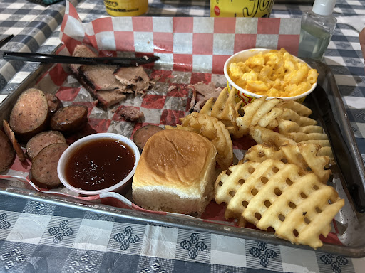 I was surprised this restaurant is a national chain. Upon approaching the Order Here sign on at the counter, you are greeted by a dirty toaster. Much of the restaurant was filthy; the kitchen, the soda fountain and cutlery/fixins area, ceiling tiles, etc. There was no music on in the restaurant so it was quiet and awkward feeling. I ordered brisket which was very dry and resembled London broil. My "texas toast" was a cold Hawaiian roll that was barely toasted at some point on the bottom. We ordered dino nuggets but were served regular chicken nuggets. Food was served on paper over metal trays. One of the trays was filthy under the paper. The fountain machine had no ice, the soda coming out of it was warm and the Coke Zero had little syrup. I went with Diet Coke. An employee did get us ice from the kitchen. There were hardly any forks in the bins. The women's bathroom soap container was broken and unusable and the men's room was filthy. There was a mini split AC unit on the wall above our table that dripped water onto it, we put down paper towels to soak it up. And to top it off, two kids meals, a pulled pork sandwich and a two-meat plate was over $50 which is very expensive.