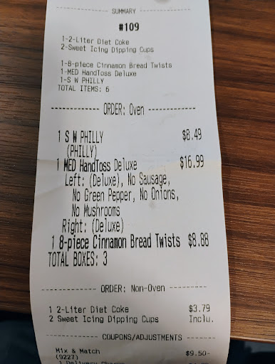 Read moreI wish we had an option to leave NO STARS. We placed an online order at 9:13 PM. I arrived there at the drive-thru around 9:22 knowing it wasn't ready yet, but hoping it might be. It wasn't ready yet. The lady at the window told me they were still working on it and to park out front and she would bring it to me in a few minutes. So I parked at 9:25 PM. People came and went, so after 20 minutes, I went to the little front window where others had been going. The whole staff could see me through the big glass windows and knew I was wanting to ask about my food. Nothing. So after standing there for about 8 minutes, I got back into my car and drove around to the drive-thru window again. The same lady came to the window and started apologizing. Since there were about 3 vehicles in front of me before I got to the window, the time was now 10:12 PM. I finally got my COLD pizzas. I did ask for a couple of garlic sauces since I had to wait so long. Which ended up tasting like mayonnaise, by the way. Too old. Yuck! This is the first Domino's I've been to with such horrible service. The upper management and owners should be very ashamed! We will never use this one again and will also tell all of our friends and family to use ANY other pizza places in this area in the future. Get it...