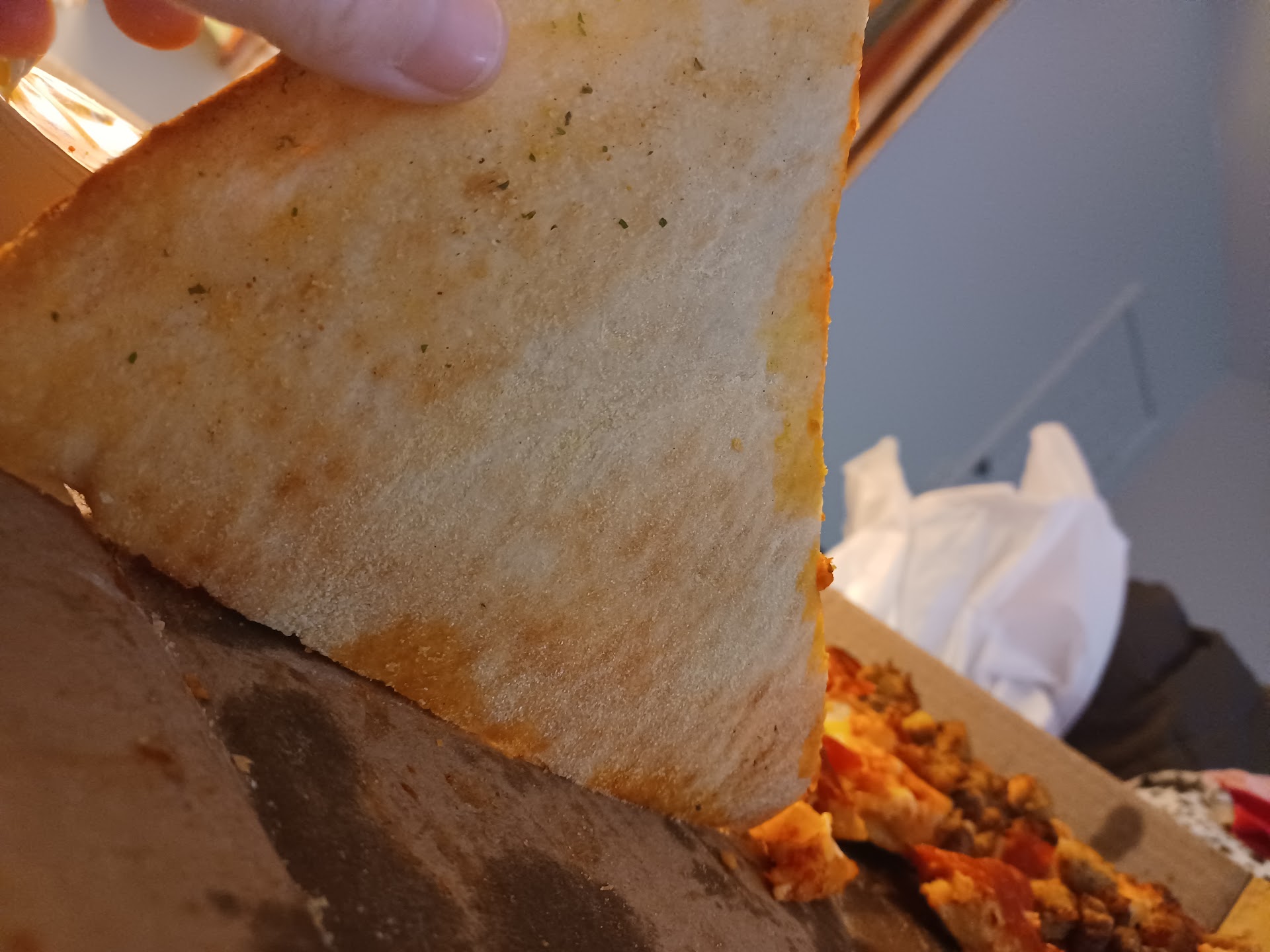 For tonight's order, I asked them NOT to cram our 4 pizzas into a 3 box bag. It was all good until we opened our pizzas... They were all slammed over to one side of the box!! I guess using the bigger warmer bag means it can't sit level in the driver's car? I mean all the garlic butter had soaked into the lid of my pizza box along one edge. I asked not to cram them into a too small bag because the top bows in & my cheese ends up stuck to the box lid. But got the same issue this time... for all 4 pizzas. Then the cherry on top: splurged on cinnamon twists & they forgot the icing cup.