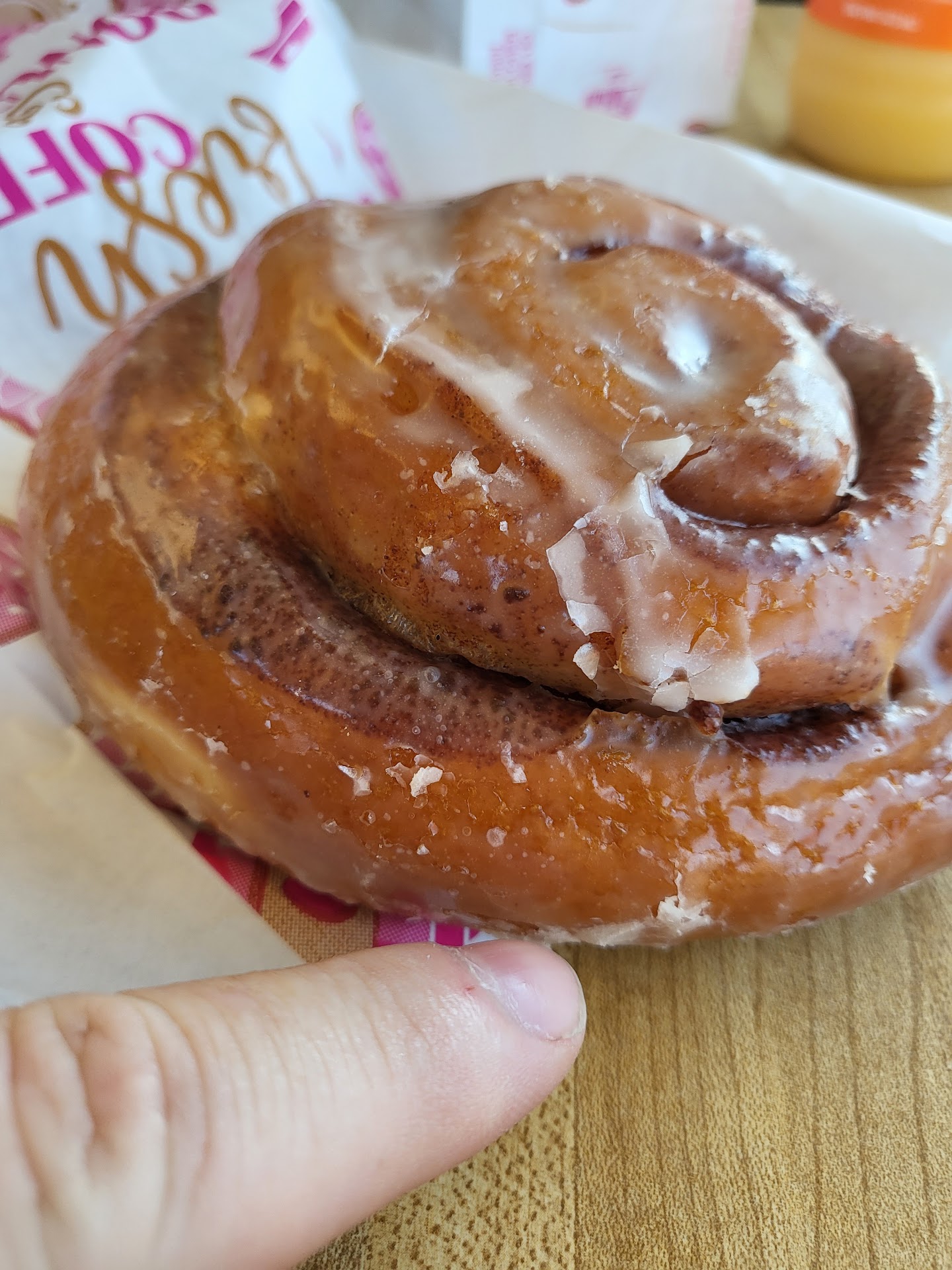 Read moreWent here after throwing away two dozen donuts from another donut shop that morning. (Check my reviews to see where) They were busy but kept pace with the crowd. Donuts were good, no fancy options, and the size of the donut was more than ample. Might be the largest glazed cinnamon roll ever!!! They have ample old time seats inside. Plenty of parking and easy access on the sidewalk. Nice people.