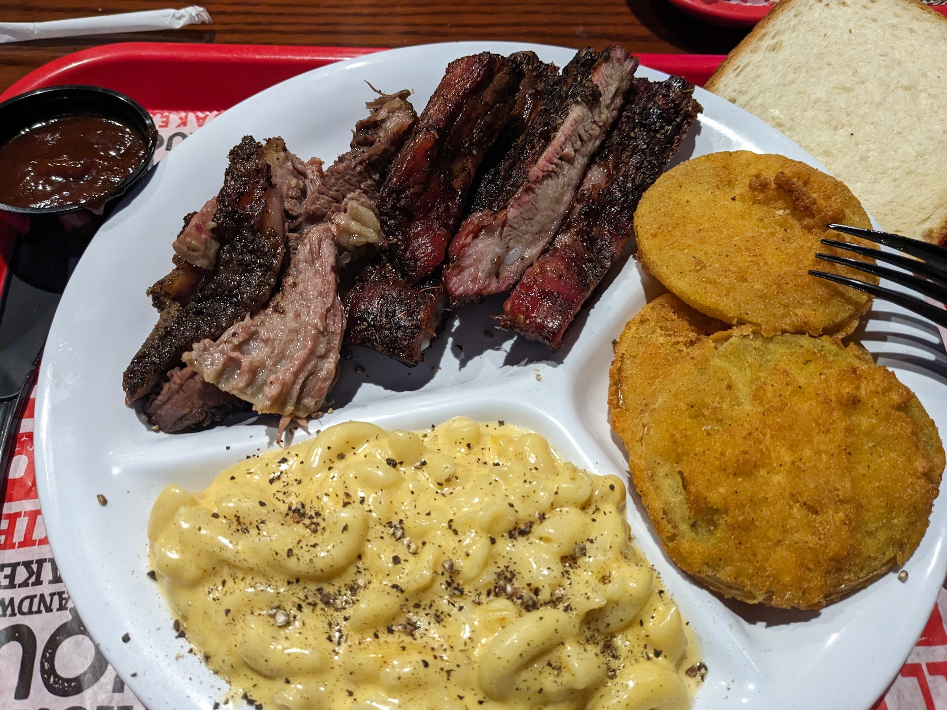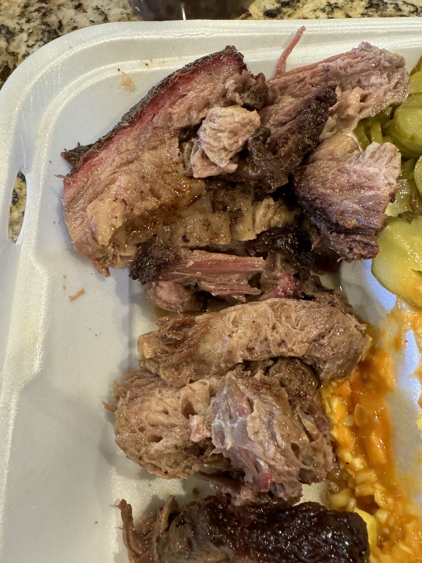 The ribs, while generous in size, lacked smoke; the sauce was pleasant but unremarkable. The brisket was very juicy and tender, but also lacked smoke. The fried okra was actually tasteless, and their slaw was overly complex (was that pickled red bell pepper?) and nowhere near tangy enough for a vinegar slaw.