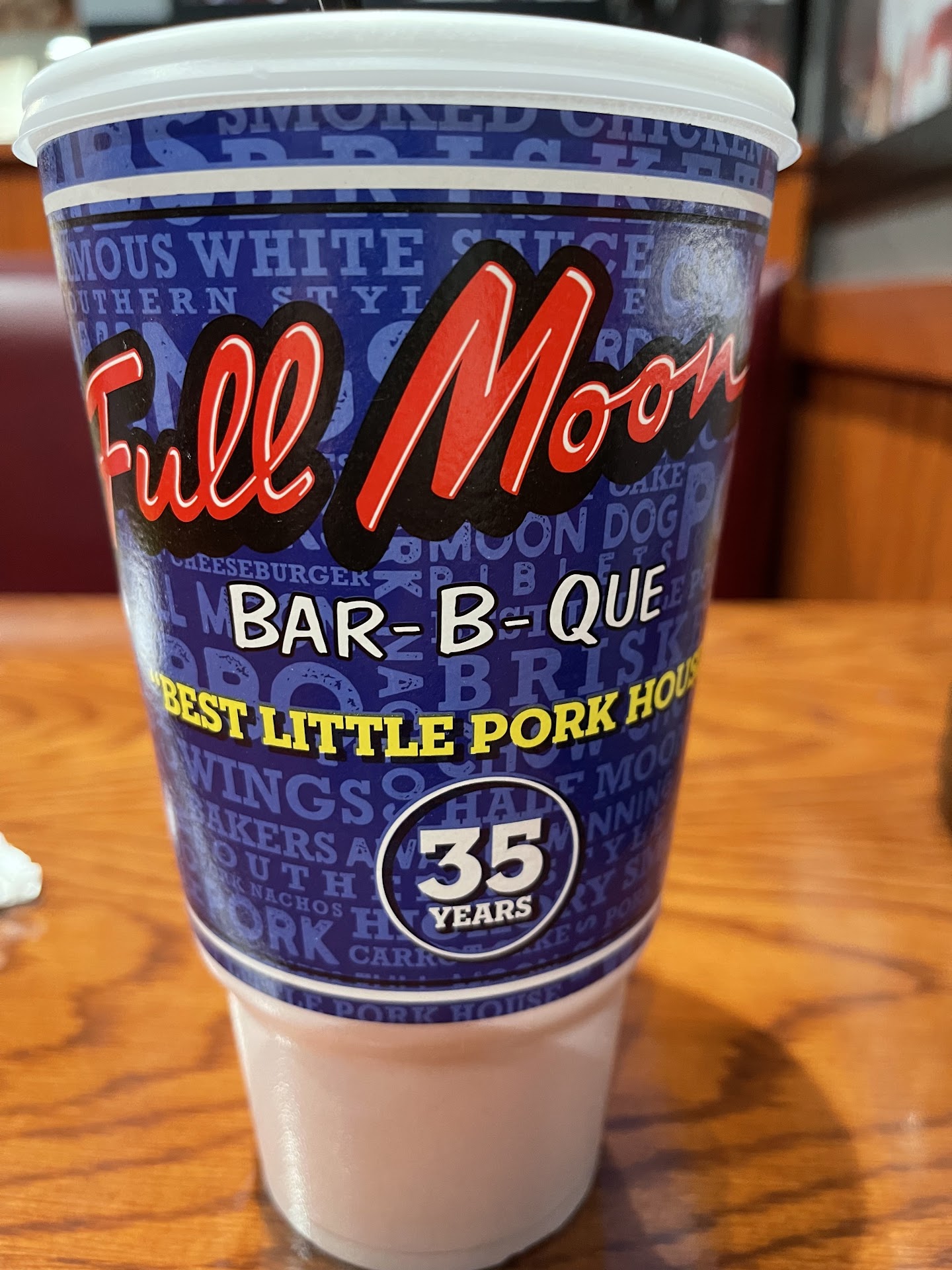 4 stars. Yea. I know. But, it isnt as good as the one in Fultondale. Ive had about everything on the menu at that location and have eaten there more times than I can count. A couple years back I was goin multiple times a week. It was easy to say that it was my favorite place to eat on my way to work. So, I was absolutely ecstatic to find out that a Full moon had opened here in Huntsville! Everything was good that I got tonight. The pork wasn't up to par though. Maybe have the fultondale team come and help if they haven't already? Or it might just take time since its new equipment and for the flavors to show through in the pits and smokers. Overall though, it was still really good and we will definitely be back. Fix the pork though. Please. It was a bit dry. I dont want my good memories ruined. Haha. But the chocolate pie was just as good as ever and the ribs were quite nice. Great flavor. Not a tough chew to them like some places ribs. Sauce is a bit spicy but it is expected. Full moon has been using it forever. Next time I will be seeing how the smoked wings stack up. :) oh, and this time I got the big baker with pork, chocolate pie, and 2 bone rib sandwich. Lots of food leftover which is always a good thing with full moon. Give it a try. If you read this far, you are already invested enough to warrant a drive over there to try it. And just to be clear. I do not work there. Never have. I just love the food. Haha. Crazy right? And I would add pictures, but the picture perfect plates got torn to pieces in seconds. Sorry not sorry. Take pictures of your own plates....