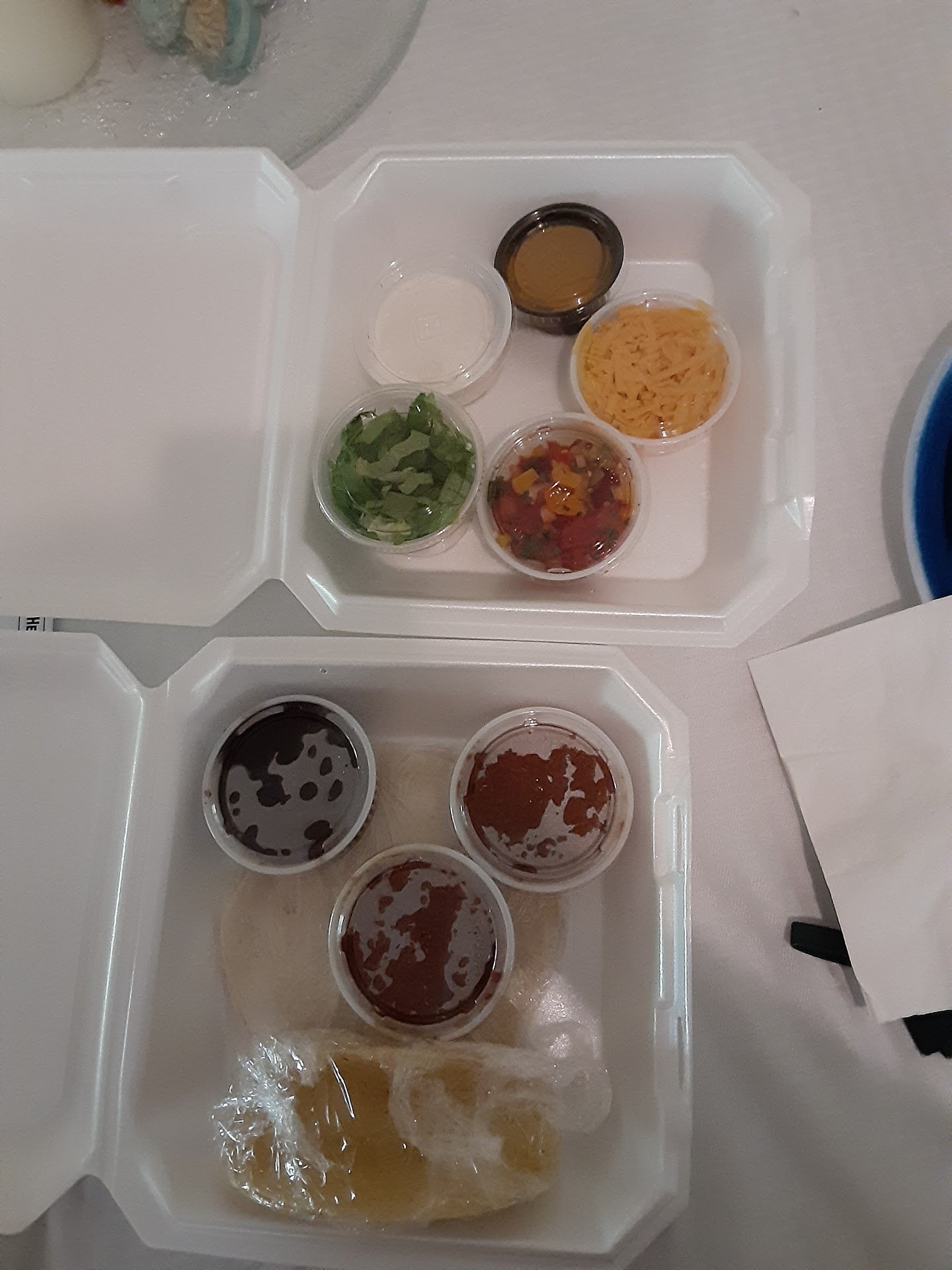I was ranting and raving the whole way home to my friend about how I was hungry and now had to wait to eat, and I was sure these dinky portions weren't going to be enough for four tacos. But I was hungry so when I got home I did start assembling and, for all my fussing, I must admit the tacos were good. I finished every bite, everything just stretched, and while I wasn't stuffed, I was satisfied.