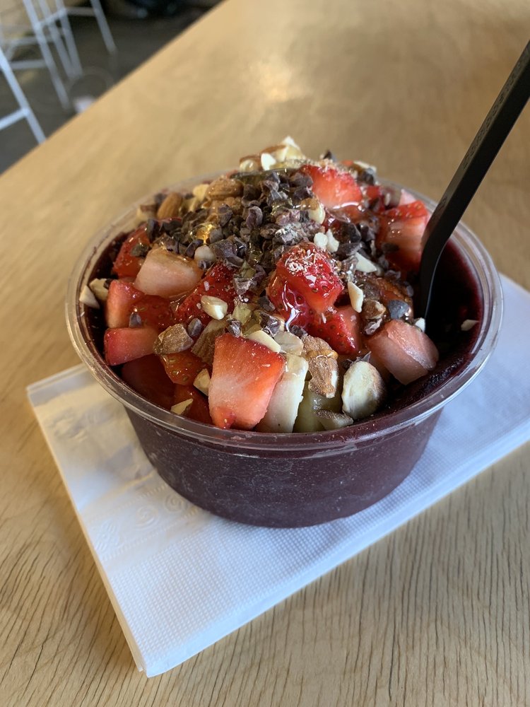 Strengths: the almonds and honey were delicious additions. The granola was the right amount of sweet, and the strawberries tasted good despite not being in season. Also, once the açaà melted a bit, it had a pleasant sweet taste and creamy texture.