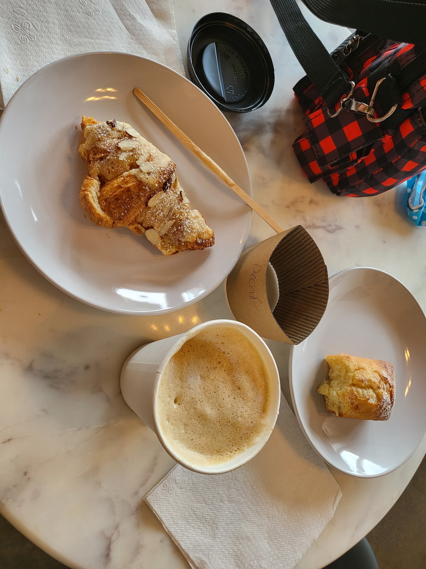 I've had their almond croissant before and didn't love it; I just ordered it again because it was available and generally a favorite of mine. They seem to make theirs by slicing a croissant open and then filling it with almond...something. It's very thin, almost like a glaze. I prefer my almond croissants to have the frangipane baked inside, and also for it to be thicker and more custardy. Idk which way is the "right" way, but this is just my preference. The flakiness factor was good, though parts of the pastry were a little dry.