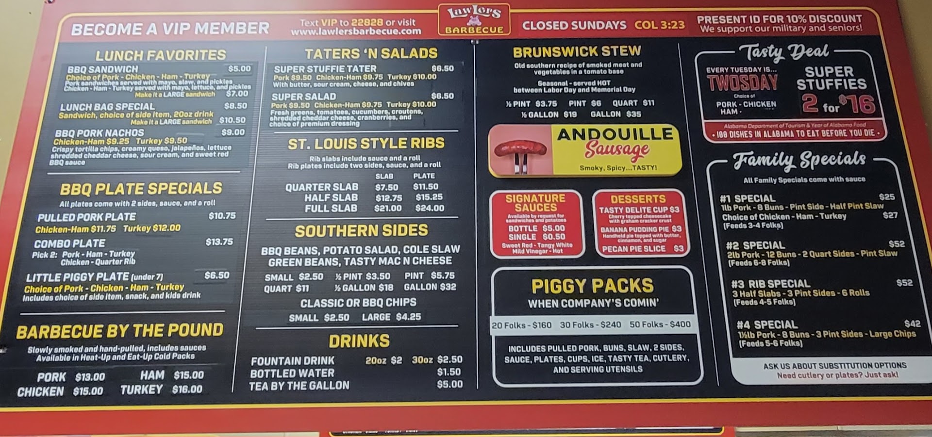 Every Saturday for the last few yearsmy dad and grandfather would eat here before heading to Walmart to grocery shop. Unfortunately my father passed away December 30th. For the first time since his passing my grandfather stopped tonight to pick up some stew for a church dinner and was greeted as always but they realized they hadn't seen either of them for a few weeks and asked about my dad. So the story was told of his passing and LawLers was so kind to donate the stew in memory of my father. I don't know who will read this but I just truly want to thank everyone that worked tonight it was such a sweet offer! WILL ALWAYS LOVE AND...