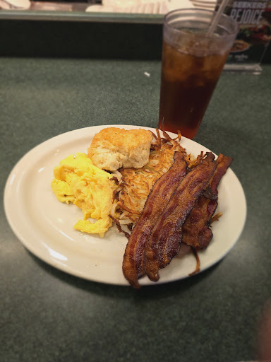 Can't remember what Dad ordered, but I ate every bit of my meal. The eggs over hard were cooked to perfection along with the bacon, not too crisp but not chewy either. The hash browns were nice as well, though they could've been browned a little further (the middle was slightly mushier than I'd prefer). The toast was, well, toast, and the prepackaged jellies were exactly what you'd expect. My French vanilla coffee was great with just a single packet of sugar, no cream.