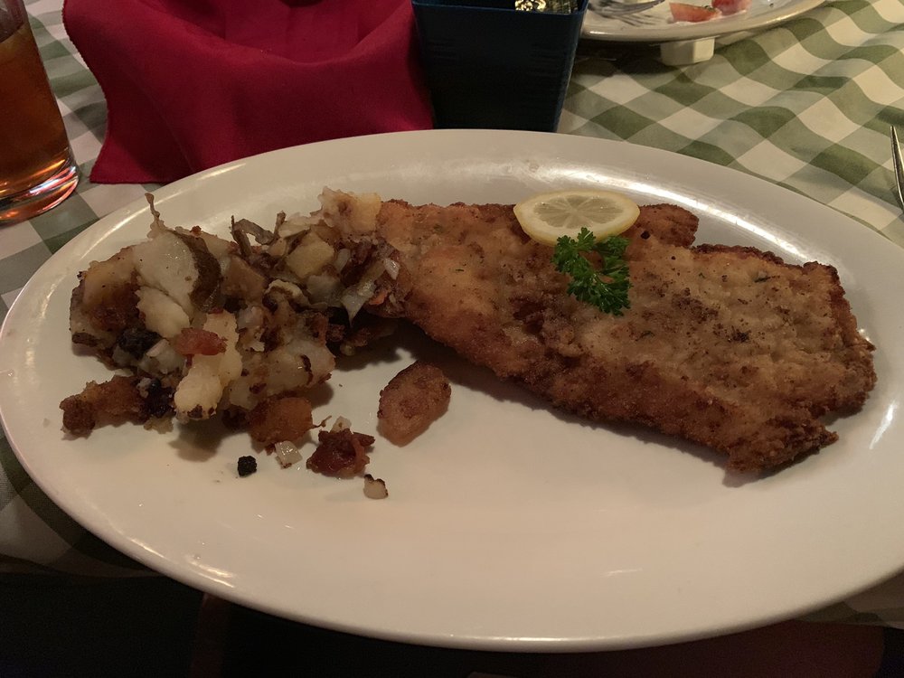 Read moreOverall the restaurant was very good and had dog friendly covered seating outside. It was obvious that our server was anxious around our dogs, but we just found her body language humorous and we were not offended. To balance this out, a young man who worked there came out, and very politely asked if it was OK to put our dogs. He was obviously a dog lover, and he was as nice as could be. The outside looks like a typical strip mall, but the inside is low-lit with a lot of character. It’s like you stepped into Narnia. I got the schnitzel cordon bleu, and my wife got the honey pecan chicken. Mine came with fried potatoes and slaw, and she had the fried potatoes and red cabbage as her sides. A salad is an additional $5 and bread is $1 per person. The bread came out, fresh and warm and was well worth the extra cost. We both were surprised to like the red cabbage as much as we did, and the entrées and potatoes were so delicious. We ordered a Reuben to take home with us, and it was one of the best I’ve had. When we told our waitress, we might want to get a couple desserts to go, she seemed a little frantic and was pressing about which ones we wanted. I told her I’d need to go inside and see what they had. They have a very nice display case with a large variety of cakes and cheese cakes. I selected a caramel cheesecake and a slice of carrot cake. They were $10 per slice and their size didn’t match their price, but were very tasty. When it was time to pay our waitress advised us that their credit card machine had just gone down and was rebooting. I said that’s no problem, we will just hang out for a few minutes. Her reply was that the last time it happened it was well over an hour before it came back online. I went out to the car in the rain to see if I had enough cash to cover our bill, and luckily I did. I would think that some patrons in the restaurant would not be so fortunate, and I wondered how the restaurant would handle that. This restaurant has lots of character and great food, but be forewarned that some of the staff can be a little sharp edged in their interaction with you and their desserts are good but a bit pricey. I would...