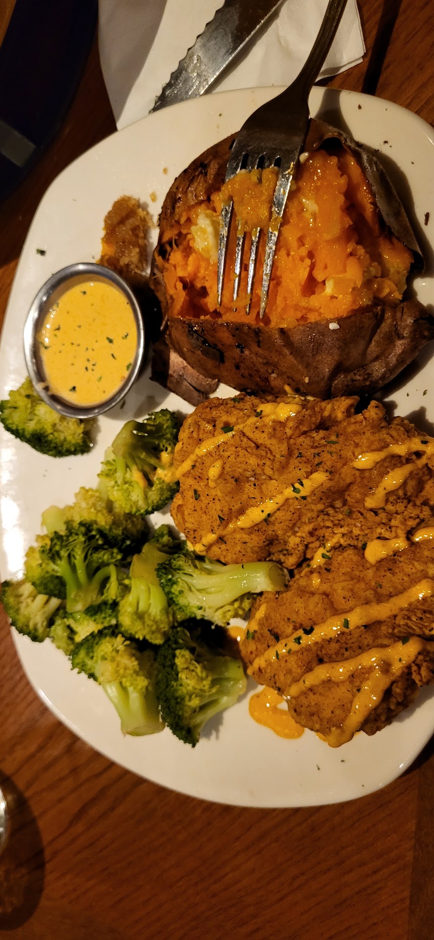Read moreIt appears to me that Outback is priced as though their ingredients, food preparation and table service are premium and top-notch all around. That is definitely not my experience at the location on highway 72 in Madison. We dined there tonight after a long absence (due to similar factors from the previous visit). To cut to the chase, if you prefer not to waste time on my full review, I would say the rather average performance at this location results in the prices being about 30% overstated vs value. Well below “not a good value” in my opinion. The two of us arrived a little before 6:00, and there was a crowd waiting to be seated. We were shown to a 2-top in the bar area after about the 25 minutes promised. That is the first big negative. The 2-tops do not have servers. They have a bartender who takes your order and who visited our table 4 times or so in the hour and a half we sat there. We successfully placed an order and received an appetizer, then waited a long while for our entrees. No one asked about more bread or offered to take our dirty dishes away. If there is a manager for this location, you could not prove it by my observation tonight, they certainly didn’t visit our table. I finally flagged a passing employee down and asked them to check on our food. She returned in about 5 minutes with our order. I fear we would still be sitting there had I not taken that action. The quality of the ingredients appears good but doesn’t look any better than what the Cisco truck probably delivers to the other restaurants up the road. I ordered the fried chicken steak (at least it looked like a pounded chicken breast on the menu picture – to allow for better crust to chicken ratio and enhance the flavor) but received what appeared to be a straight-out-of-the-bag chicken breast plopped with little fanfare into the fryer. The thicker parts had no connection to the batter whatsoever. The circumference of the finished product would have looked good protuding from the edges of a hamburger bun. It had no similarity to the menu picture. The baked sweet potato was good, not very hot, and unfortunately had the brown sugar I requested be left off. The broccoli was part mushy and part raw. Years ago, my family dined at Outback almost weekly. After their corporate upheavals, the result has lost the focus, impact and appeal of that original design. The staff are friendly and seem to have the best intentions. The restaurant had largely cleared out when we were able to pay and leave, including the couple who were escorted to their table just before us, and who finished their food and left before our food was delivered. For the privilege of sitting in the restaurant for two hours, we paid $90 for 2 drinks, two lessor-priced entrees and one...