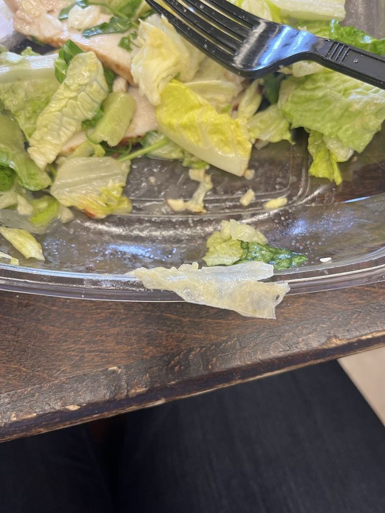 I'd not had the Asian sesame chicken salad before. I did like the almonds and the wonton strips and the dressing was okay. However, the lettuce was often discolored and old looking, there were enormous cilantro stems in there (lots of soapy bites), and the chicken was also an unpleasant color and very rubbery. I mostly ate around the chicken and cilantro and yucky lettuce, but there wasn't much left that didn't fall into one of those three categories.
