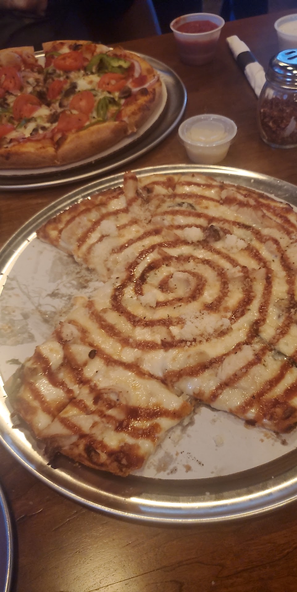 My parents split a Canadian bacon and mushroom pizza. Husband had a personal sized supreme pizza. My friend and I both got calzones. I thought the breading on my calzone was really good, but I was somewhat disappointed to cut into it and find marinara sauce already inside. It's my fault for not reading the menu more closely; I just assumed the sauce would only be on the side as everywhere I've ever ordered a calzone that's been the case. Personally, I don't like much marinara sauce inside my calzone and could've done without it. If/when we return, I'll try something else or ask for the sauce to only be on the side.