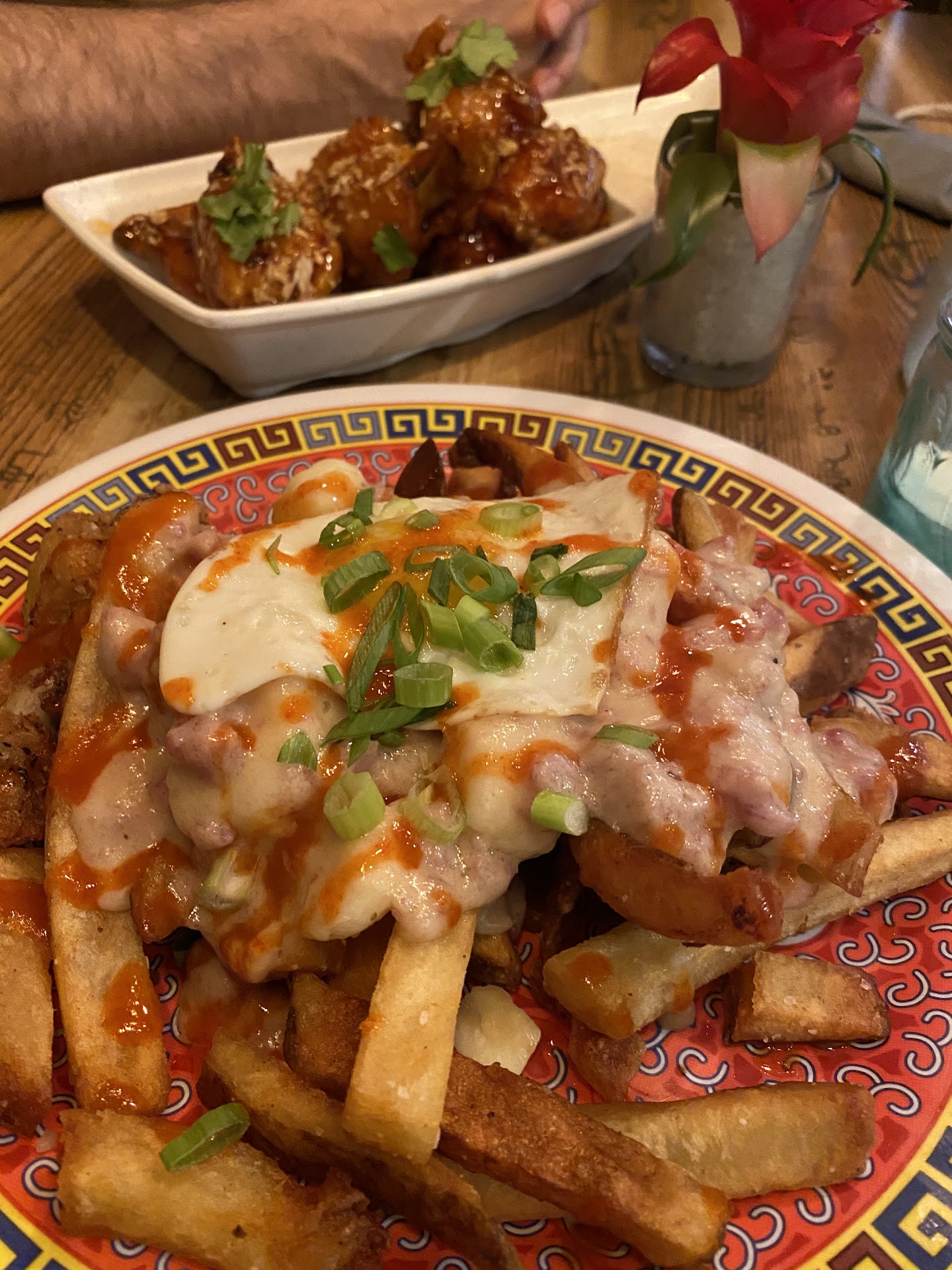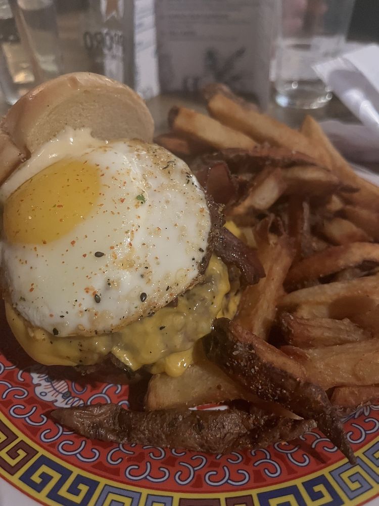 The food was resoundingly fine! In some ways though it was my biggest disappointment because I've been excited and intrigued by the PS menu in all its iterations since they opened. I ordered the K-Mac burger with fries, husband got the pork katsu sando, and others at the table got a variety of other things, to include the beef bulgogi rice bowl, the poke nachos, wings, Thai coconut curry, and a small order of fried rice.