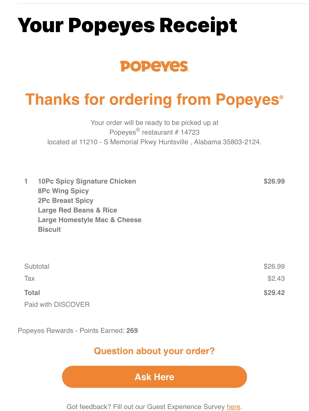 I was very disappointed with this location. We are in Huntsville attending the funeral of a close family member tomorrow, so we ordered a family meal online via the Popeyes app thinking it would easier. Mistake #1. My husband went inside to pick up the order only to find out the order had not been made. The Manager Quetta advised that we need to pay additional money because our family meal had white meat. The order was already about $30. Also, on the app I had already paid an additional charge for upgrading to mac & cheese. My husband explained all of this. The Manager Quetta advised that her boss told her to charge an additional fee on all online orders that have white meat. She advised that the Popeyes app is a third party app and it has no affiliation with their store and they only get paid once a month from them. Therefore, we had to pay the extra money or she will not fulfill the order. My husband declined to pay. The manager advised that most people usually don’t argue and they just agree to pay additional fees to get their order. My husband told Manager Quetta that he was not paying a dime more. I was outside in the car and overheard everything on the phone; so I walked inside of the store to join my husband. I listened to the manager and I explained that we did not order any additional breasts. We ordered a family meal and we were able to customize our food on the app and no other applicable charges was added. Therefore, I did not understand why she had taken it upon herself to apply additional charges that did not apply to my order. The manager did not seem willing to listen to any rational reasoning, so we then asked her for a refund. She explained that she had no control over that and I would have to deal with the third party app to get a refund. I was confused about this. The manager advised that she had the ability to charge more on the order but she did not have the ability to cancel the order. My husband and I found it strange that she could charge more but not cancel anything. In the future, I think this location needs to put a notice to all customers on their lobby doors and drive thru to alert customers to the new policy they have at their location in regards to online orders. The notice should explicitly say that more fees will be added on all online orders in store during pickup. Also, the company Popeyes should list a disclaimer on their website as well, so customers should be aware prior to ordering. I will be contacting corporate to voice my concern regarding this as well. I attached a picture of my online order...