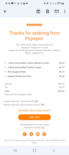 Read moreI went to this location for the first time on May 31, 2018 after having been disappointed at the other 2 locations in the area. BIG MISTAKE! This was by far the worst location yet! I placed my order through the drive through. The lady who took my order was unprofessional, rude and was rushing me like she had better things to do. They gave me part of my order wrong, I mean completely wrong. When I addressed it with the cashier she responded with attitude, "Did you place your order or somebody else?" I am thinking, WHAT? I handed her back the items that were wrong as she turned toward the kitchen and screamed out, "This lady said she didn't order this!" It took 2 people to figure it out. Then the lady at the window's friend drove up and parked her car on the side of my vehicle, got out and they shook hands and exchanged what appeared to be a small bag/envelope of drugs. WTH. I will never, I repeat, NEVER PATRONIZE ANOTHER POPEYE'S IN HUNTSVILLE! EVER! Who does that? How can every location in this area be filled with rude, incompetent and unprofessional people, unbelievable! The sad things is my food was hot and good! Who would patronize a place that treats their customers like garbage and is poorly managed. I called and reported it to corporate and the representative taking my complaint couldn't even get my order straight. I am starting to think Popeye's has just declined all together. He kept stating over and over again, "...An alleged drug deal..." Okay mister well you eat there! These folks at these locations acting like characters from Love and Hip Hop, No thank you, I like my ratchet on T.V. not at my local...