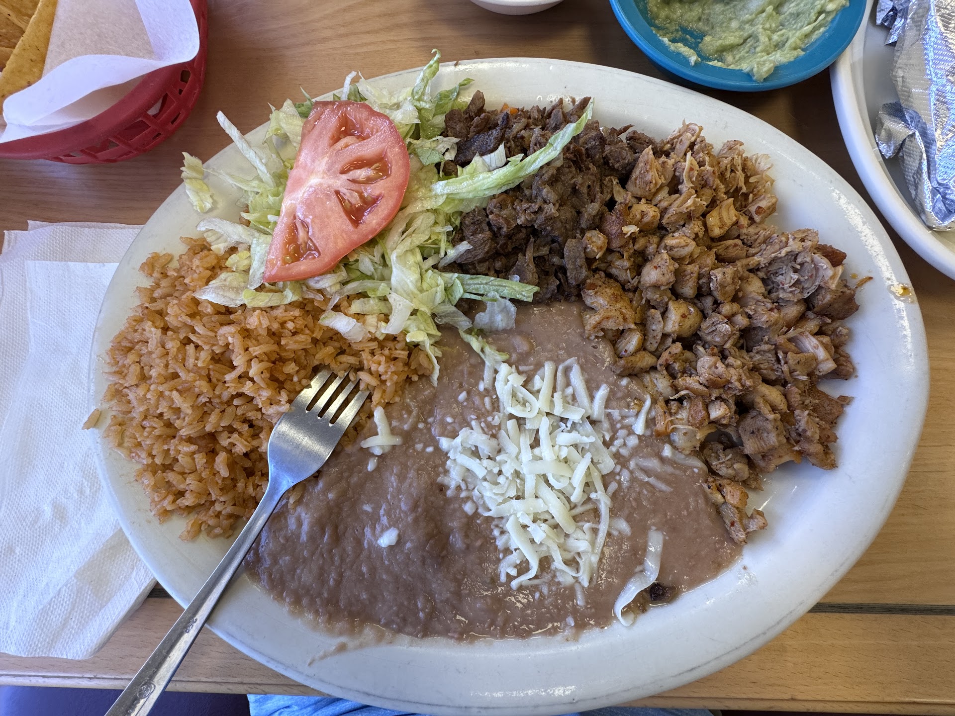 My wife ordered the Carne Asada, (beef tacos) which came with grilled onions, refried beans, Mexican rice, lettuce, tomato and avocado, pepper and fresh tortillas. I ordered the combination plate which came with chicken, beef, refried beans, Mexican rice, lettuce, and tomato and fresh tortillas. There was complimentary fresh tortilla chips and salsa. We ordered guacamole for the chips as well.