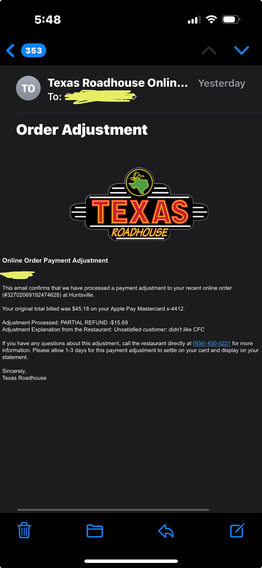 My family and I have always loved Texas Roadhouse but the Huntsville location is TERRIBLE. Yesterday I spent over $45 on a to go order that included a chicken fried chicken. After eating almost half of it and cutting into the "thicker" side of the meat i noticed it was NOT COOKED ALL THE WAY THROUGH. I immediately lost my apppetitie and was disgusted that i had even ate the thinner side of the meat that looked "cooked". I called them and complained and asked for a refund and they asked me for proof that it was pink which I gladly supplied them with through a text message. The original girl that answered the phone apologized for my inconvenience and told me she would get a manager on the phone for me. The manager who's name I believe was Kate but I'm not 100% sure answers the phone and asks "how can i help you" after i clearly already told the first girl what the problem was. The manager proceeds to get all of my order info and states "I'll will issue you a partial refund before i leave for the night" and hangs up the phone. No apology from the manager. No offer to make up for their mistake other than a partial refund. At this point after eating almost half half cooked chicken fried chicken, i did not have an appetite to eat the appetizer of rattlesnake bites i ordered NOR did i finish the loaded sweet potato or green beans that i ordered as sides because i was absolutely disgusted after seeing pink chicken. I feel as though they could have at least refunded me for the WHOLE chicken fried chicken and my two side OR even offered to give me the appetizer for free since none of it was eating due to me being absolutely disgusted that i had eaten a half cooked chicken. Now im just praying i don't end up with food poisoning. I will probably never come back to the Huntsville location. I have NEVER had any issues like this anywhere else. And this is not the first issue I've had with the Huntsville location, this was just the last straw.