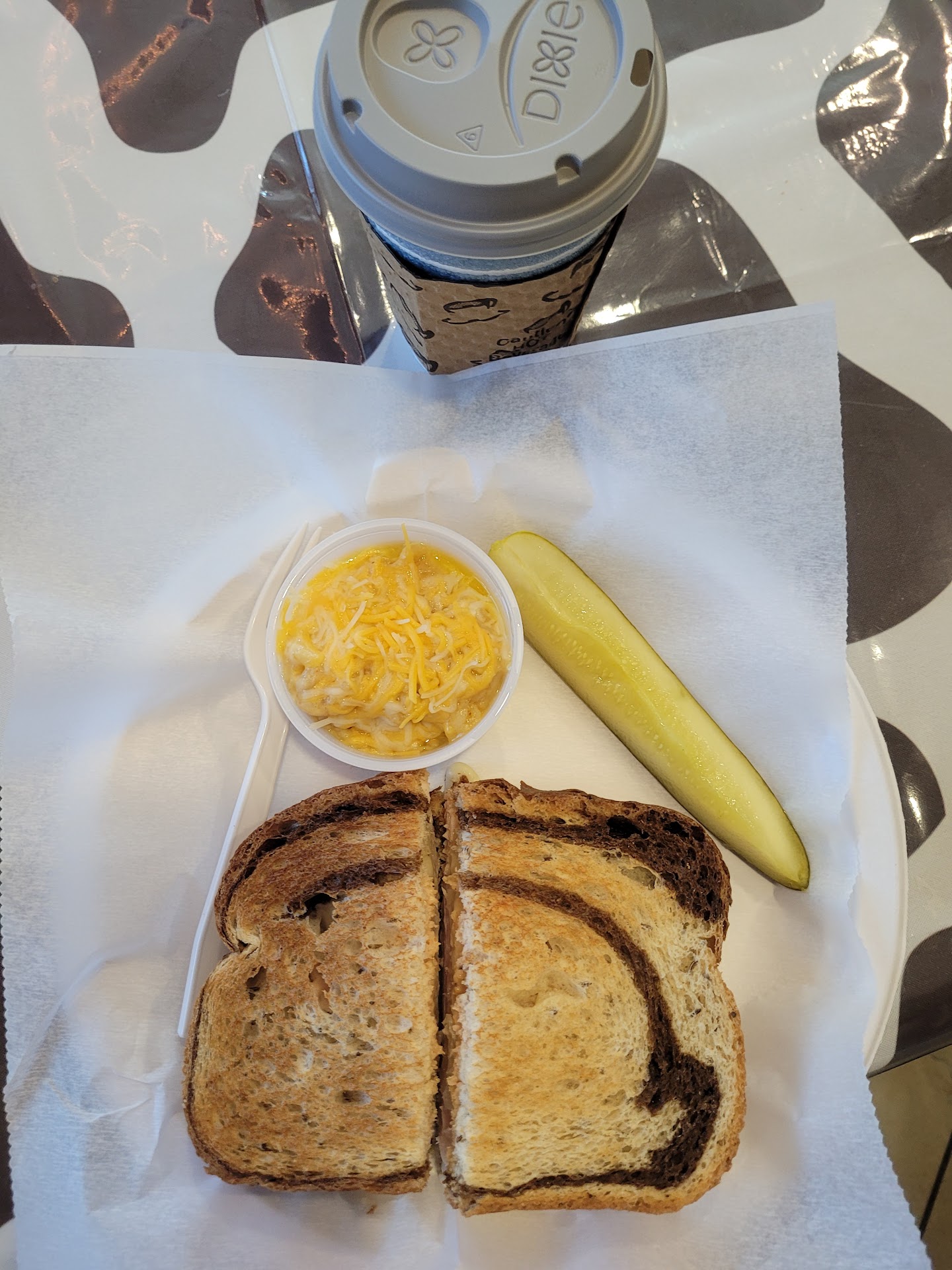 I ordered a simple grilled cheese with chips and a sweet tea and added on a peanut butter brownie because it looked too good to pass up. I have been to the Cow before, but only for ice cream, so I was excited to try their actual meal options. Overall, I enjoyed my sandwich - good balance of cheese and bread, the sourdough I selected was nice and had the chewiness that I love from that kind of bread. I wish they'd had regular, non-baked Lay's for my chips, but the Miss Vickie's did the trick, too. The sweet tea was really solid, not overly sweet, and fresh-tasting. I prefer my brownies without chocolate chips inside, but that's not a mark against the Cow really, just a personal preference. I ate around the chips and thoroughly enjoyed the gooey brownie and the peanut buttery icing goodness.
