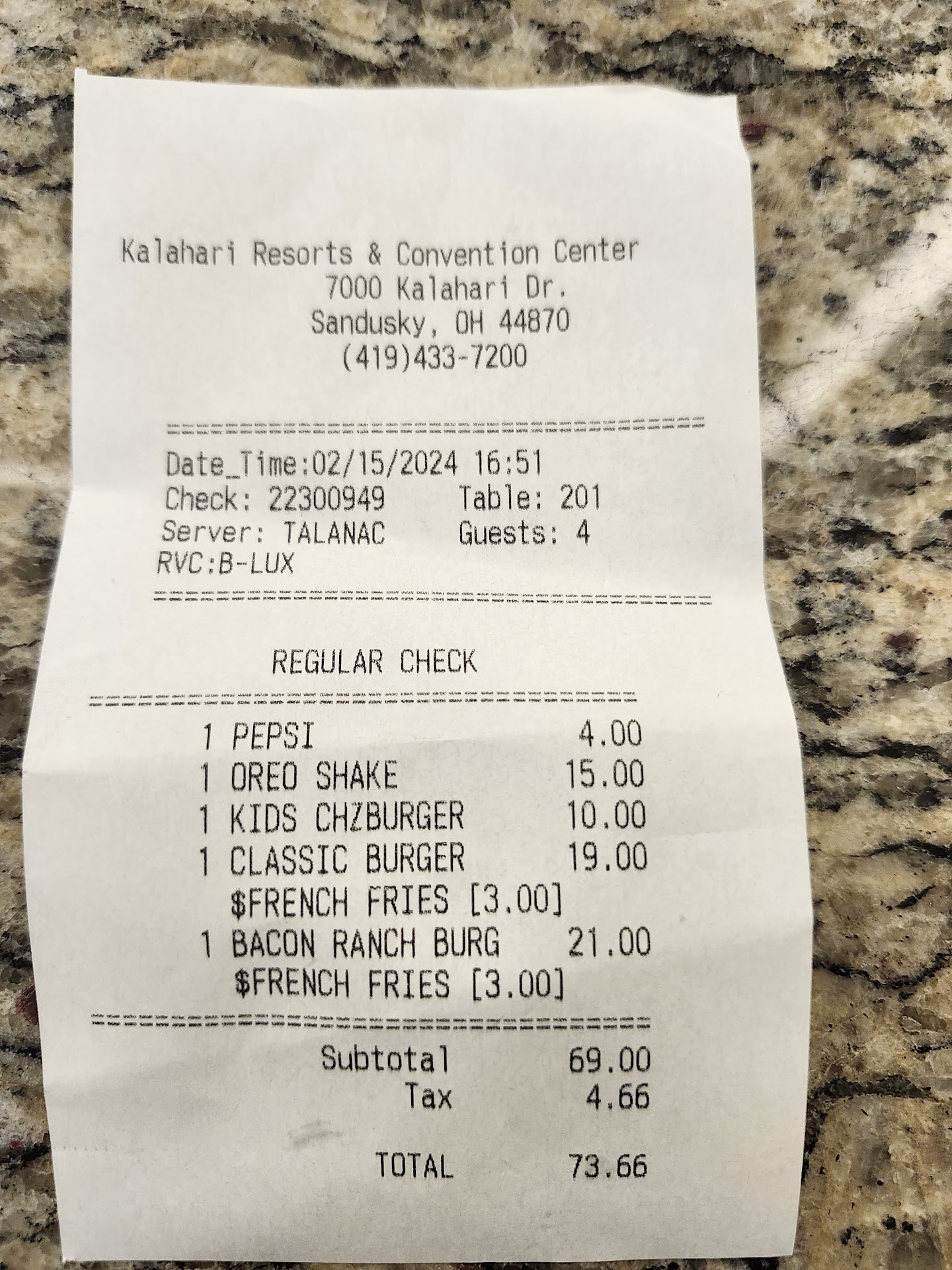 We found ourselves in a predicament with tiping as it wasn't the Waitresses' fault but the mangers, so we still tipped even if it felt odd with how terrible the treatment for the problem was.