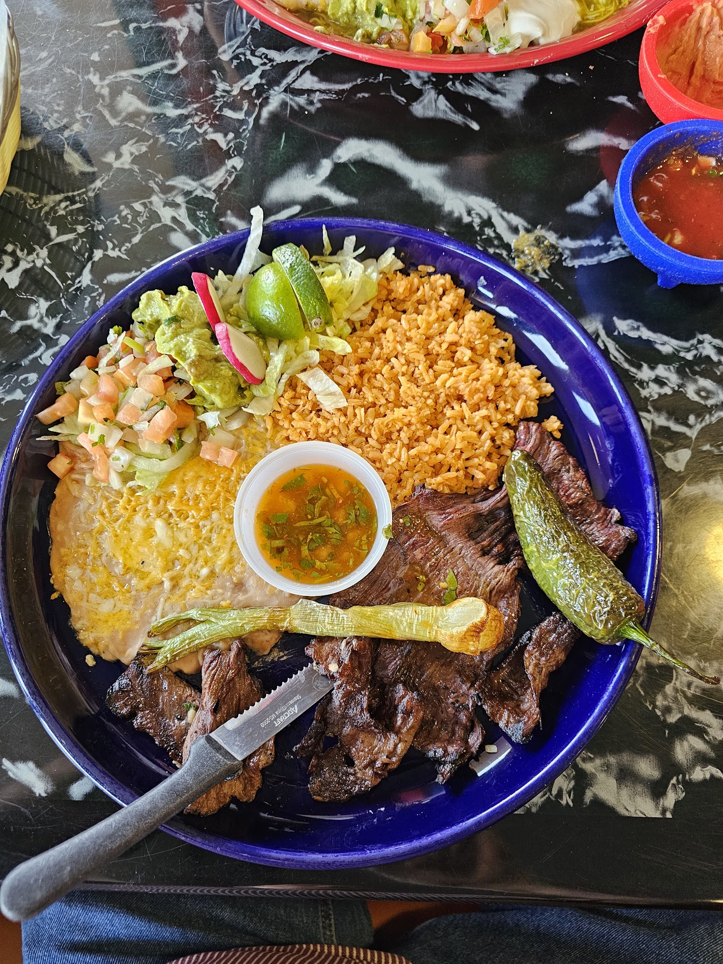 I ordered the Carne Asada plate, and it was very good as well. They use a good amount of chicken bouillon in their Spanish rice, and it's the most flavorful I've had. They use a bean that's different from a pinto bean for their refried beans. The result is a very light brown bean that's similar in color to a navy bean. Their refried beans have a great flavor, too!