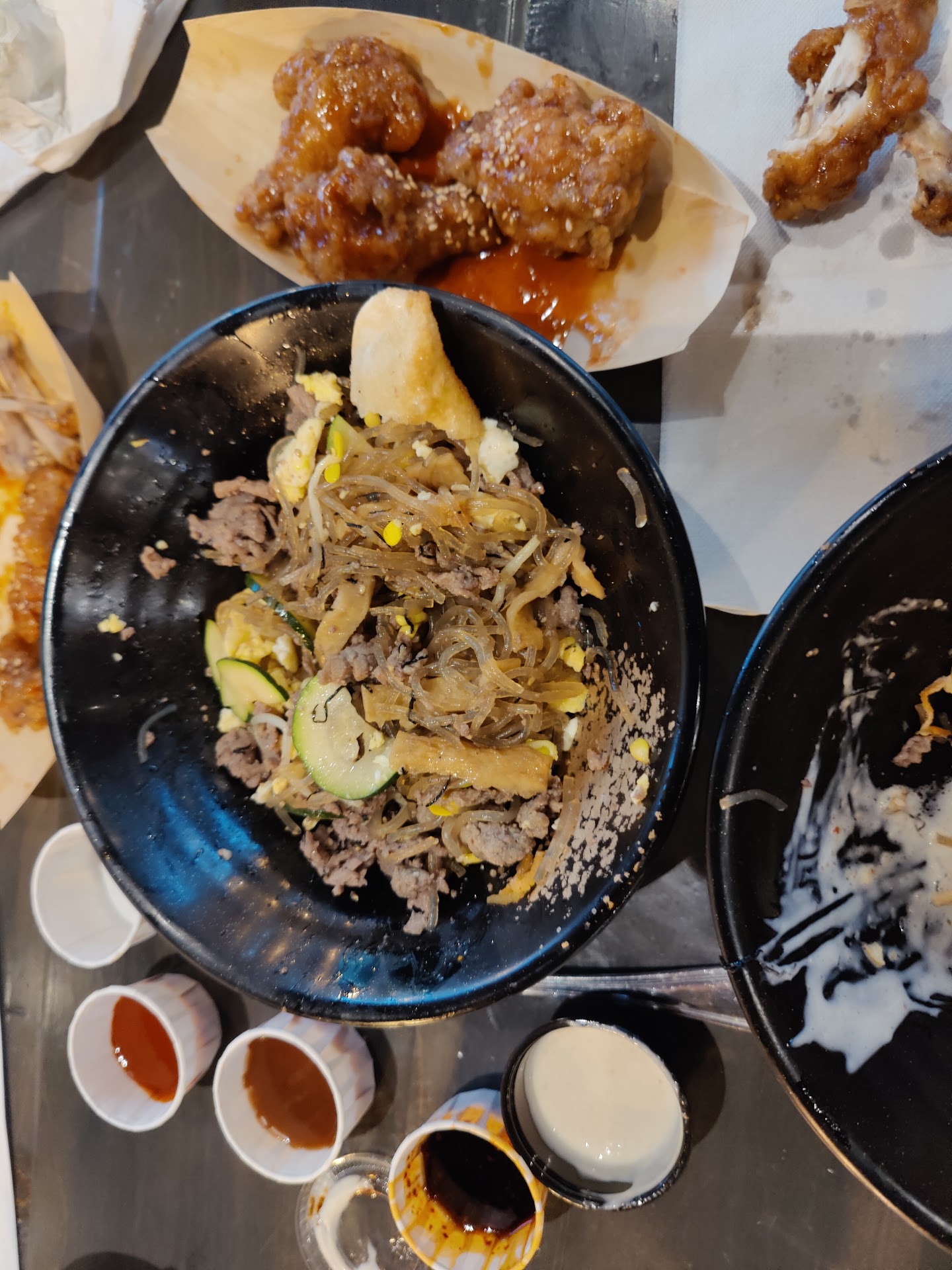 My husband and I went for dinner on a Sunday night about an hour before closing. As we walked in there was a large sign blocking the way to the counter. It told us to order at the kiosk. Thankfully we were used to those things. We chose to get a bowl. Then you have to choose if you want a regular bowl or one that comes with two pot stickers, fried, or one that is sizzling hot cast iron. My niece got that last time I went and it literally smelled like her food was burning as we ate. I guess that is why they call it Burning Rice, lol. You have to choose your rice or noodle, they have white, brown, or veggie rice, we chose noodles. then you choose your protein, we got bulgogi beef but they also had shrimp chicken, pork, tofu, etc. Next you choose your veggies or toppings. We chose carrots, broccoli, bean sprouts, another unknown item which turned out to be the noodle we already chose earlier, fish cake, which looked like sliced fried scrambled eggs, and nori, which is thinner than the carrot slivers we got. Ours was $13 but my husband chose extra meat so that was like $1.50 extra. We also got a 5pc. Honey Chicken wings for me and a Spicy order for my husband. They were around $7+ each We shared the bowl. Oh and I had to try the honeydew melon drink they had and my husband got a fountain drink. I think all in total our bill was $38. You grab your drink cup and a numbered metal thing next to the register and tell the computer your number. When you get to your table there is a bar that has sauces, chop sticks, utensils, condiment cups, straws and to go containers you can go up and get whatever you need or like, oh and of course a soda fountain. They bring your food to the table when it is done. As I knew he would my husband loved the spicy wings. They are soooo crispy! I love, love, love the honey wings! Best wings ever!!!! We were stuffed when we left and took two and a half wings home with us. My husband said we would probably go broke if he had one of these restaurants near his work. We will definitely be back as...