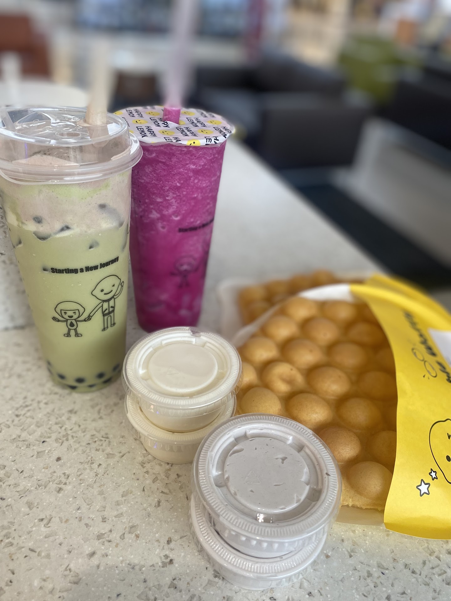 Absolutely adore this spot! The bubble waffles truly hit the spot for us each and every time. We love the taro and salted cheese dips. Each person gets their own waffle okay!!! No fighting over the last bubble. Their boba menu is rather extensive so theyâll be sure to have something to satisfy your taste buds. Staff is always welcoming and helpful. The next time youâre in NorthEast Mall, be sure to show your support and hit up Happy Lemon! Their location at Bellaire in Houston is awesome as well. You guys rock...