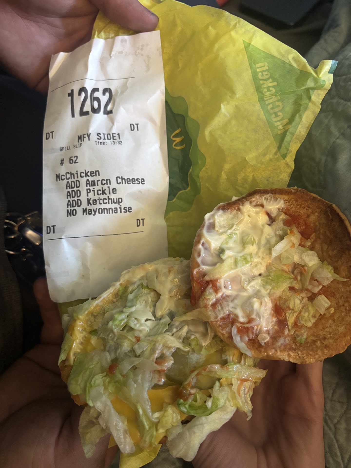 Good example of this is receiving a warm and almost overprepared Big Mac (way too much sauce), with stale fries and cold McNuggets in the same order. Little attention to detail but, again, it's McDonald's.
