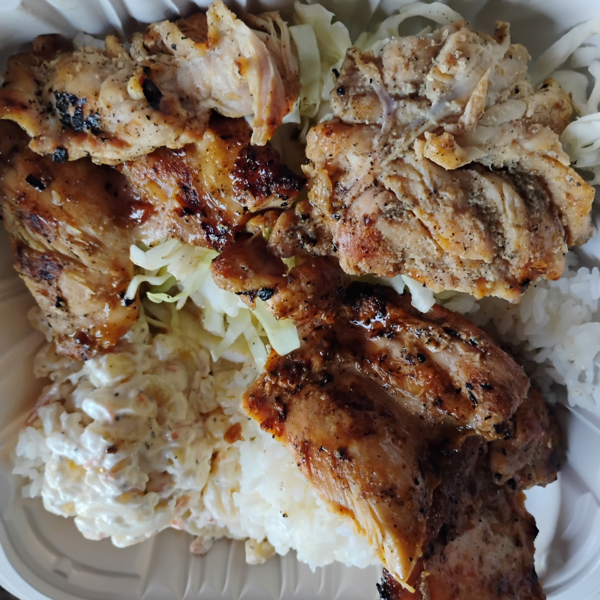 The teriyaki chicken was great, it's sweet and a bit charred/crispy on the edges but also a bit juicy on the inside which IMO is perfect. The peluah chicken just tastes like chicken with salt and pepper on it, very lame. The plain white rice was cooked nice and soft/sticky, but it is still plain white rice so I didn't really eat much of it. The cabbage bed was just some chopped up raw cabbage, and the mac salad was macaroni and mayonnaise with some shredded carrots in it, pretty bland and forgettable.