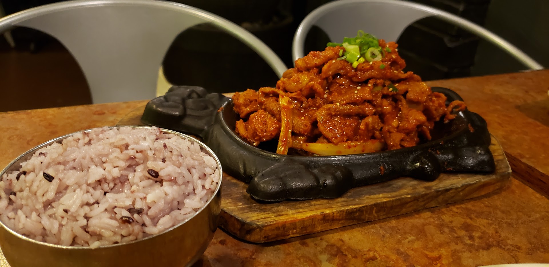 The spicy pork was excellent and appropriately priced. Served with purple rice, the spice was there but not so much that it would overpower other flavors.