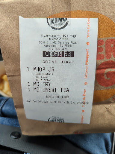 Read moreThe ppl here are heaven sent. Im a truckher our of NC that was brought here to Texas to a fraud company that tried to set me up. The situation left me stranded here in Texas 4 months Pregnant with my dog. It's Thanksgiving and I can't get no one to help me get food from my family. Being that I grew up in foster care it makes sense. So all day I've waited for anything to help me get food but still nothing. My head started to hurt so I decided to see what I could get for 1 dollar at this burger King as I know the rodeo burgers are cheap. So when I asked aboutc1 dollar items, the staff decided to help me and feed me and my child. The paid the meal for a whopper and threw some chicken fingers in. Im so thankful to them. And to God for allowing them to bless me and my child because I felt I would pass out from starvation. Thank yu...